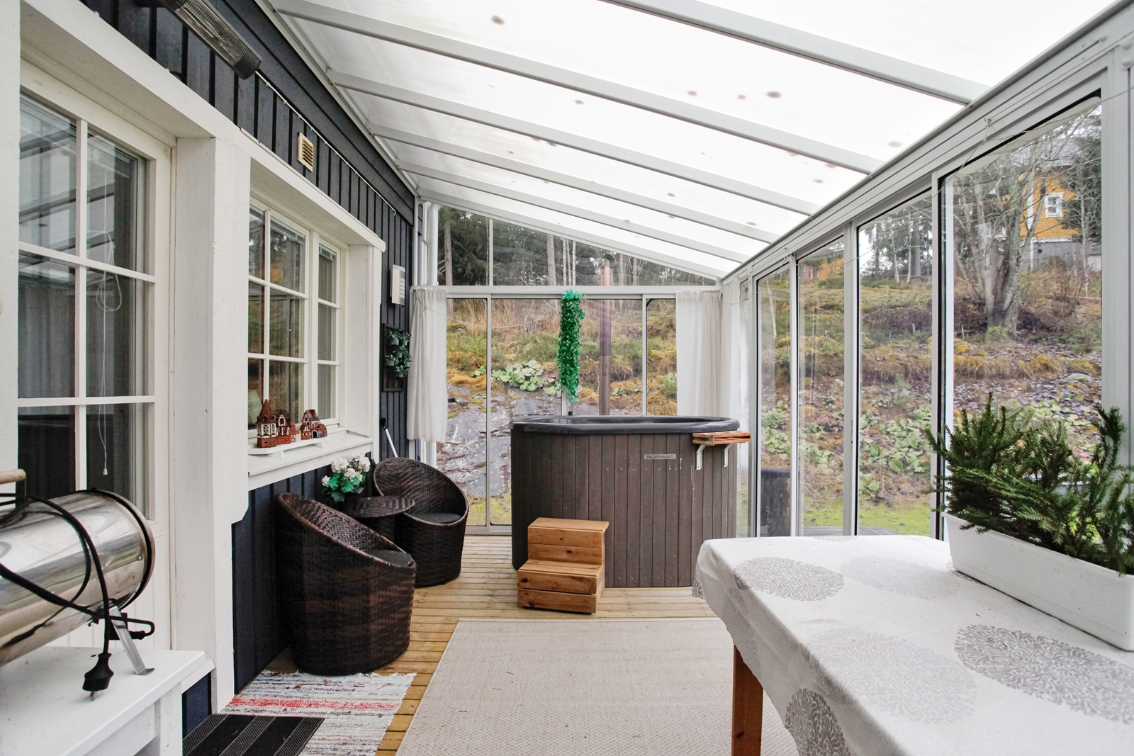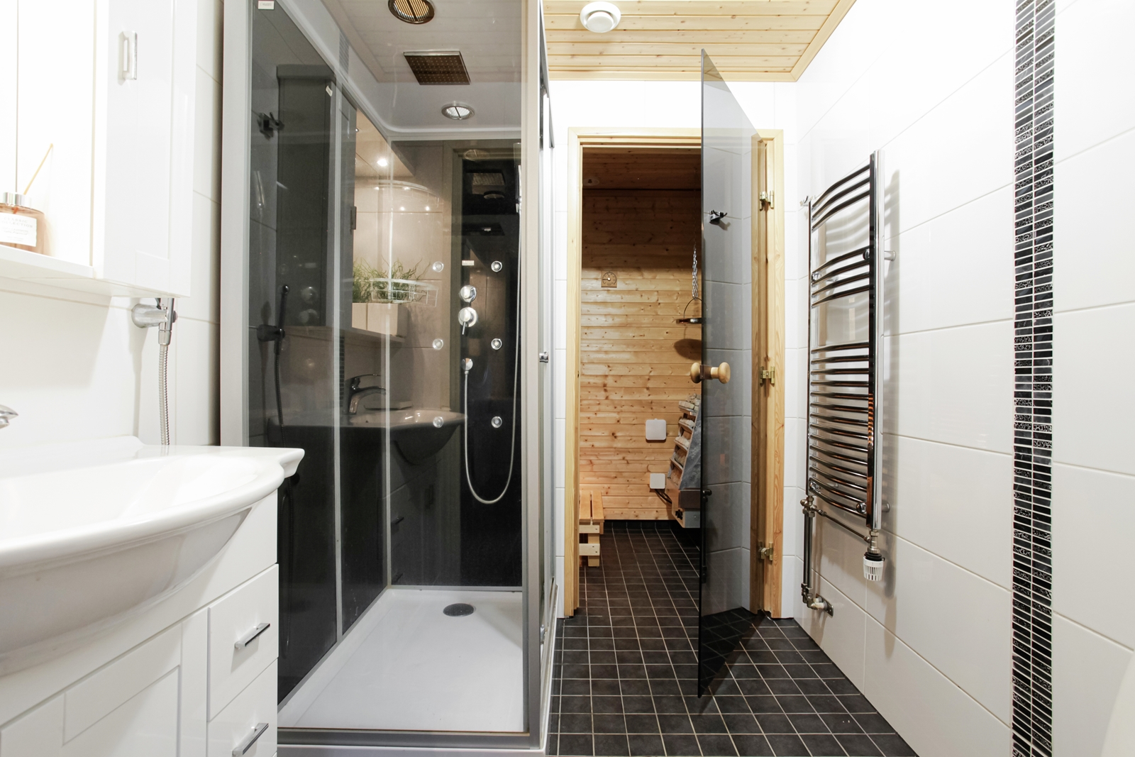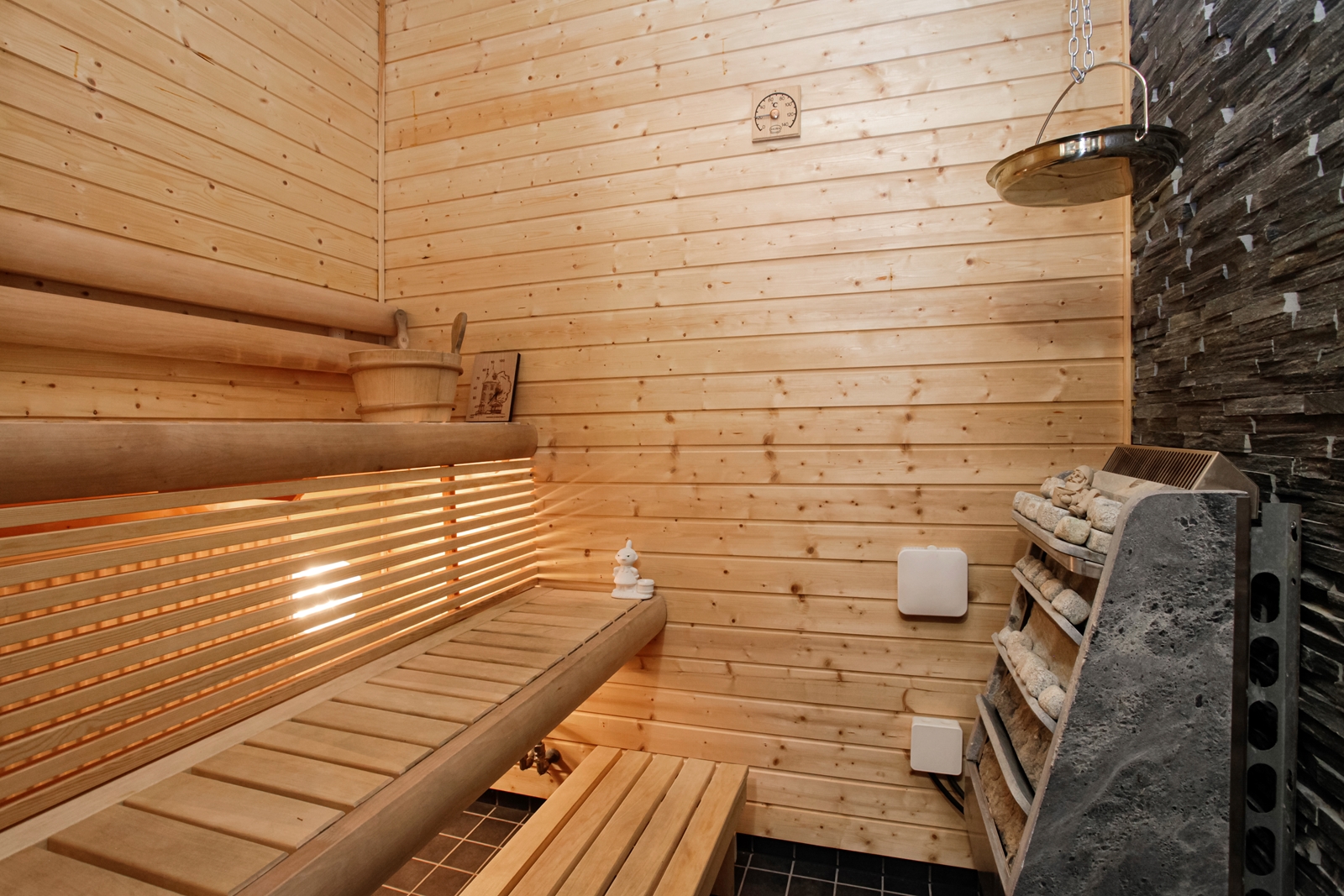 Saunassa pääsee nauttimaan rentouttavista löylyistä, ja osin lasitettu terassi infrapunalämmittimellä tarjoaa miellyttävän paikan oleskeluun ympäri vuoden. Terassilla sijaitseva palju lämpiää puilla, mikä tekee kylpyhetkistä erityisen nautinnollisia.