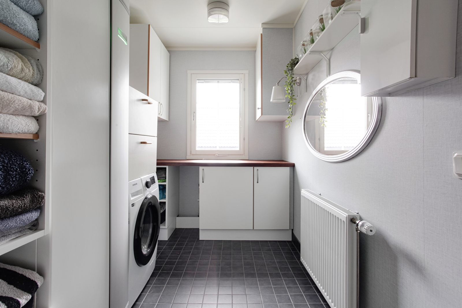 | Kodinhoitohuoneen kuvaus | Pesukoneliitäntä, pöytätaso, lattiakaivo ja pesuallas, lattiat (laatta), seinät (tapetti) |