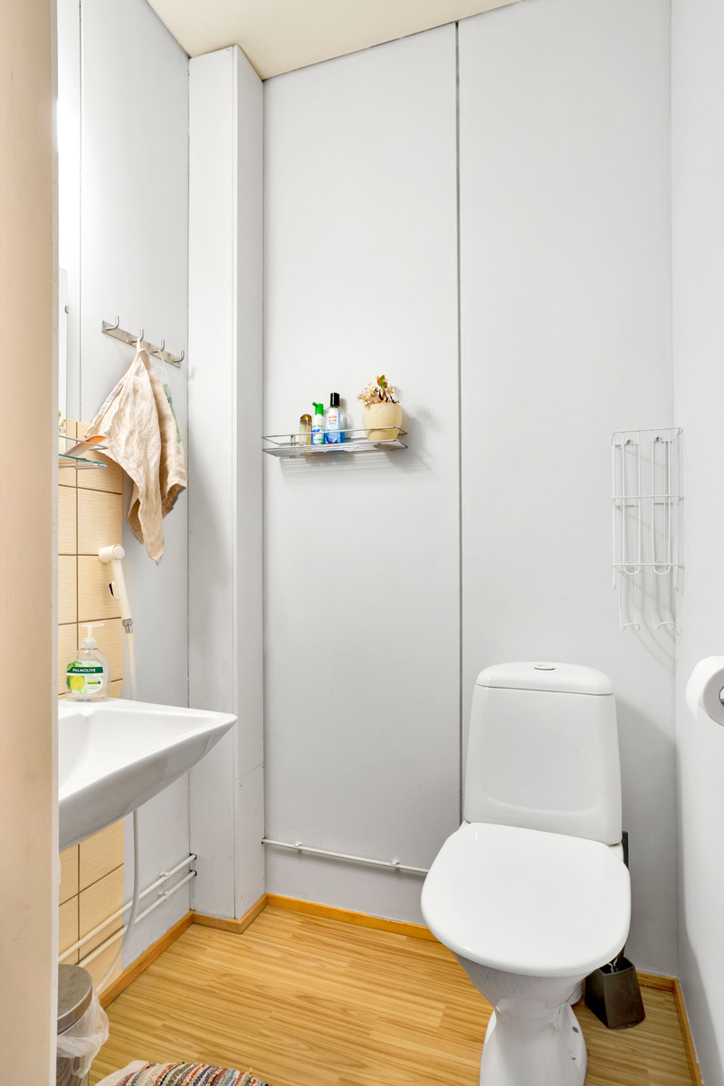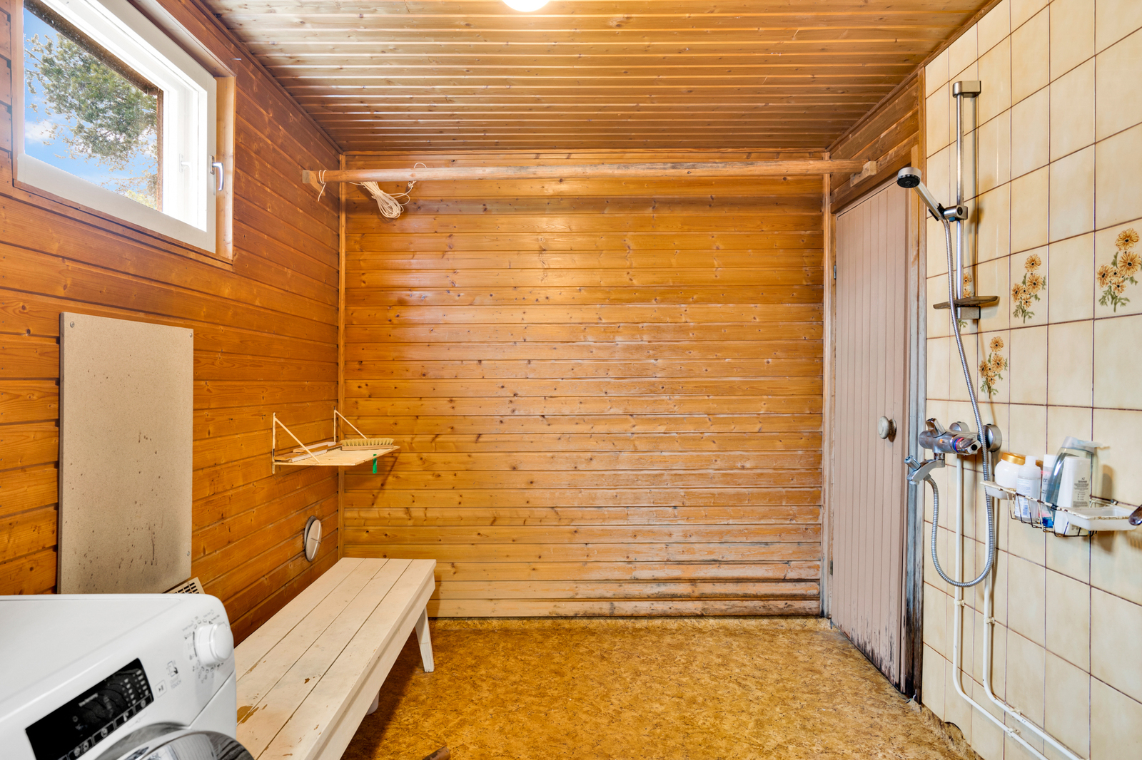 Suihku ja pesukoneliitäntä, seinät (kaakeli ja puu), lattiat (muovimatto) |
