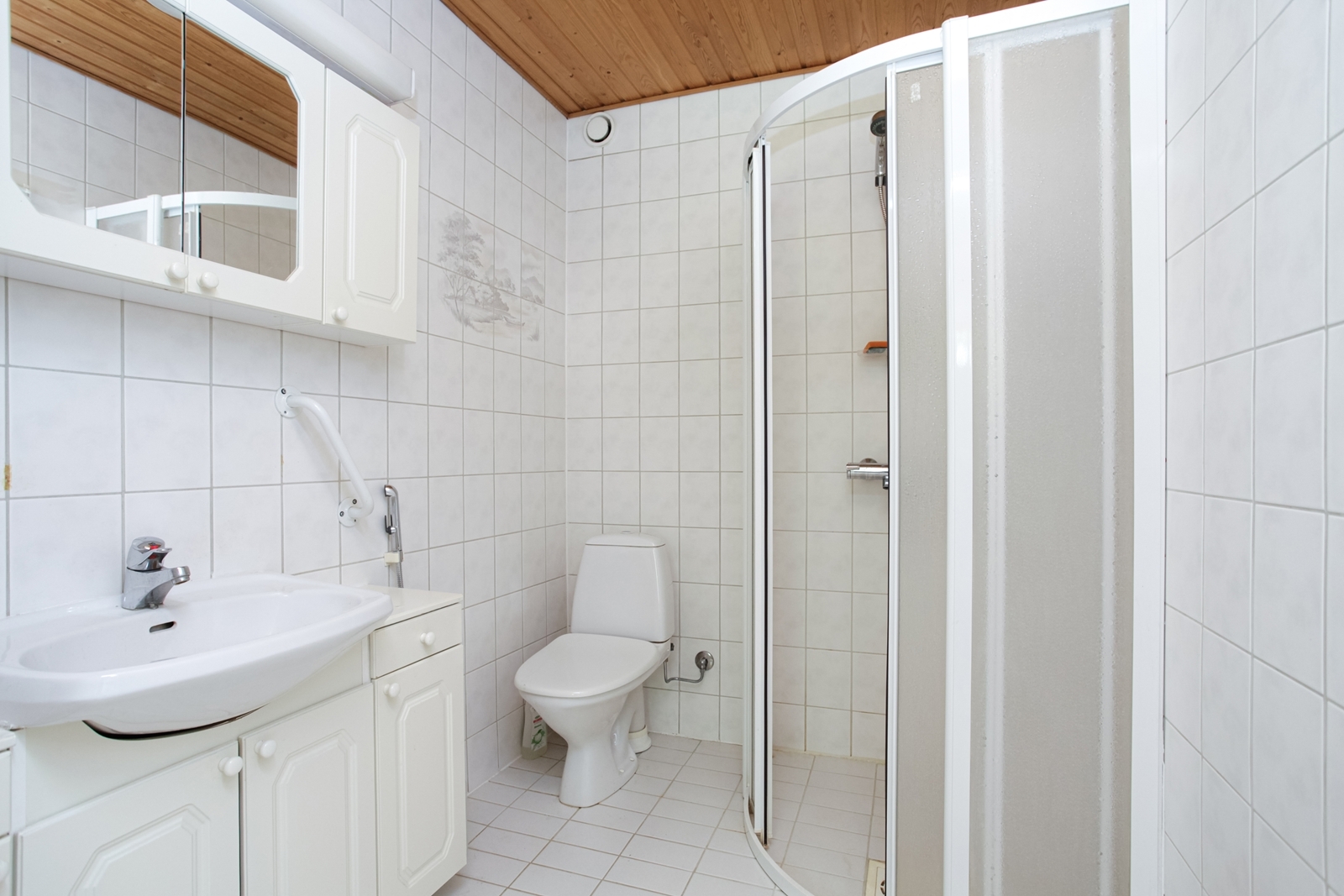 | Kylpyhuoneen kuvaus | WC-istuin, suihkukaappi ja suihku, seinät (kaakeli), lattiat (laatta) |