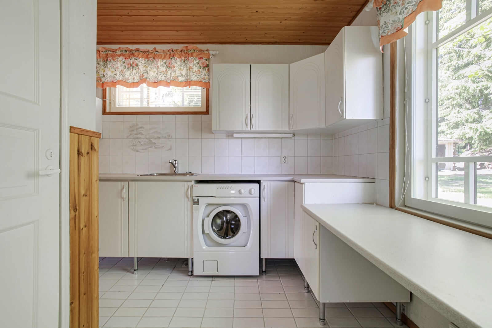 | Kodinhoitohuoneen kuvaus | Pesukone ja pesukoneliitäntä, lattiat (laatta), seinät (tapetti ja kaakeli), uusittu 1993 |