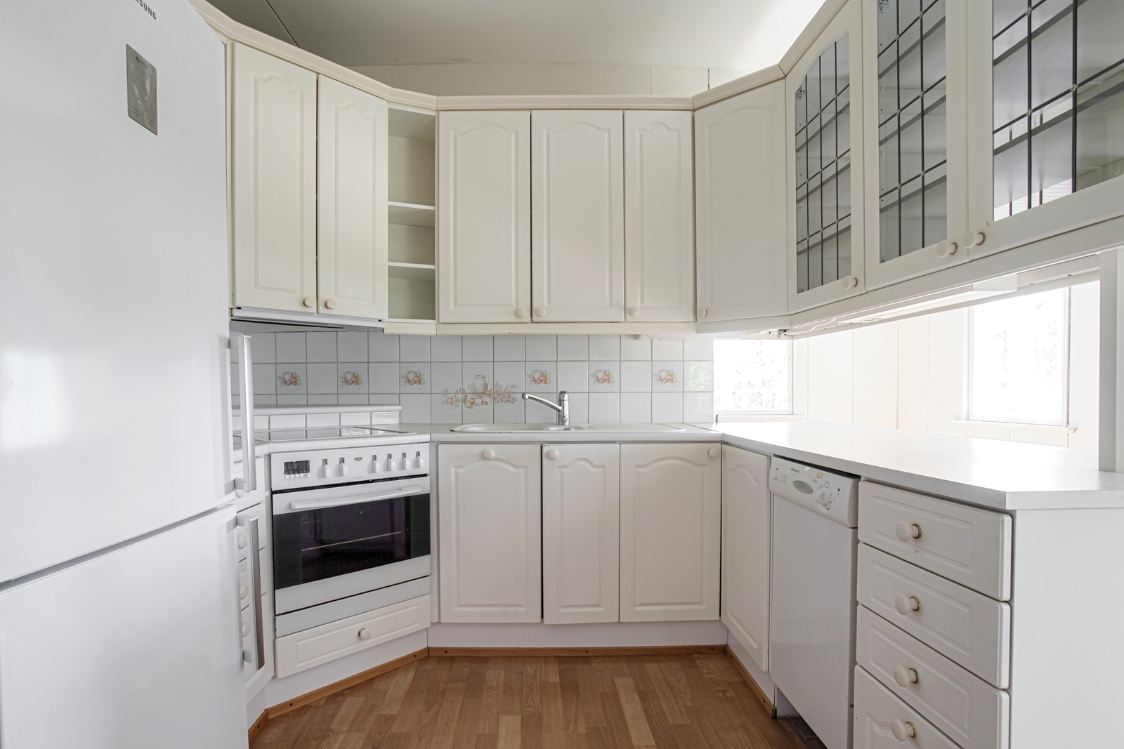 | Keittiön kuvaus | Liesi (Keraaminen liesi), työtasot (laminaatti), seinät (laatta ja maali), lattiat (laminaatti), liesituuletin / hormi |