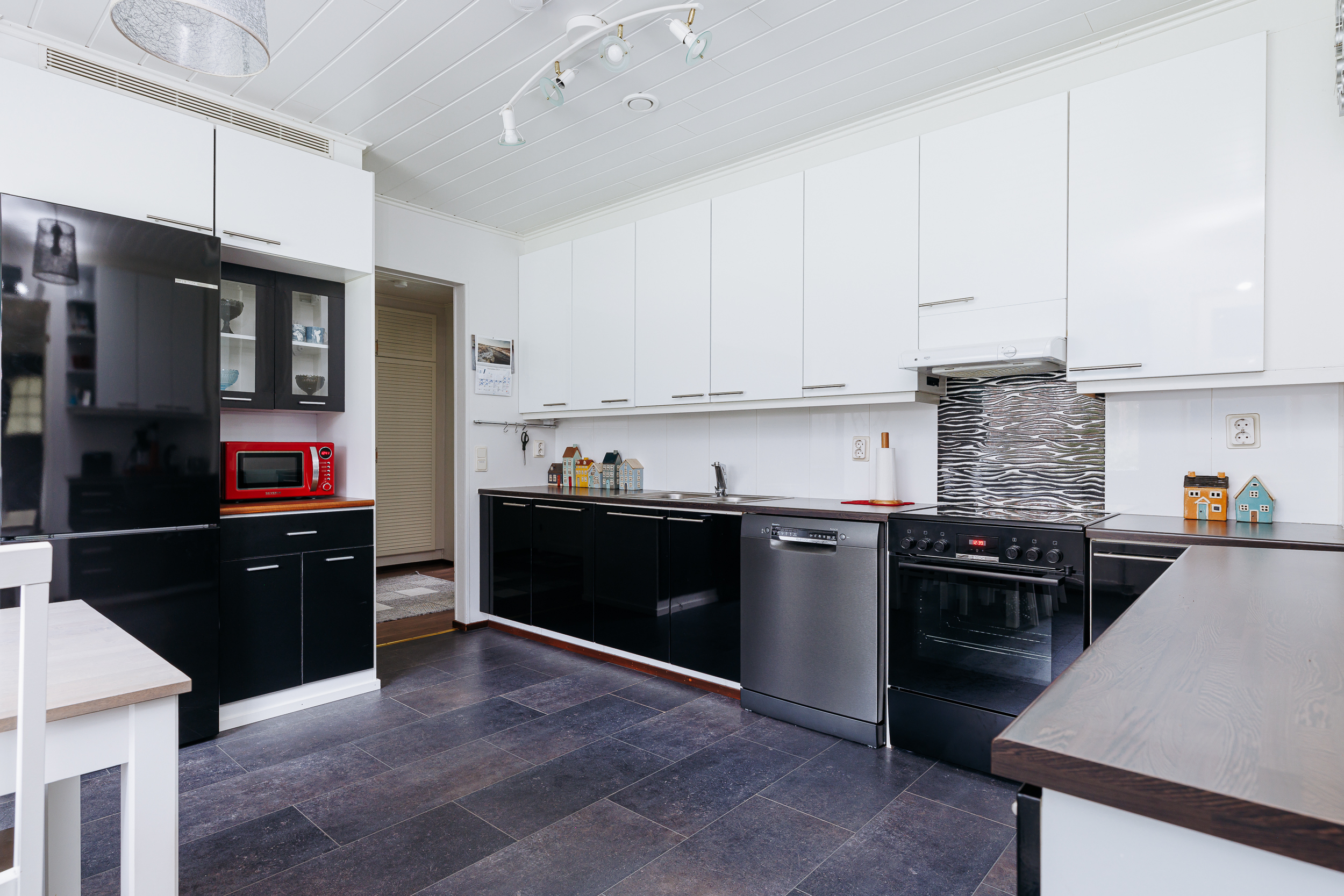 | Keittiön kuvaus | Liesi (Keraaminen liesi), työtasot (laminaatti), seinät (maali), lattiat (laminaatti), jääkaappipakastin, uuni, liesi, liesituuletin ja astianpesukone |