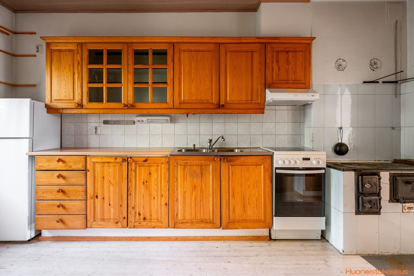 | Keittiön kuvaus | Liesi (Keraaminen liesi ja puuliesi), työtasot (laminaatti), seinät (maali ja puu), lattiat (lauta), liesi, jääkaappipakastin ja liesituuletin |