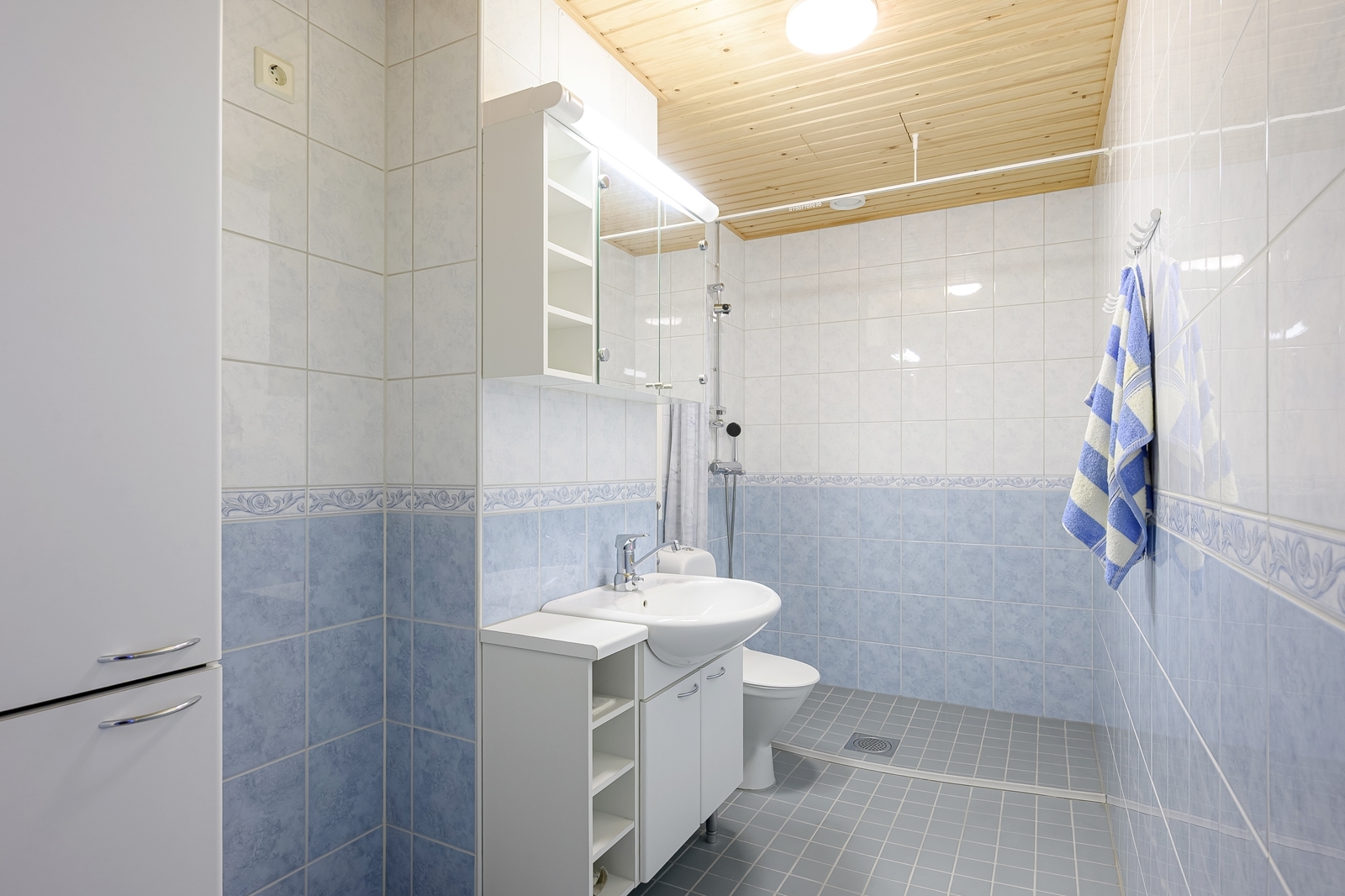 | Kylpyhuoneen kuvaus | Suihku, peili, wc-istuin ja kiinteät valaisimet, seinät (kaakeli), lattiat (laatta), Paikka pyykinpesukoneelle tai pesutornille löytyy kylpyhuoneesta, mutta pesukoneliitäntä asennettava. |