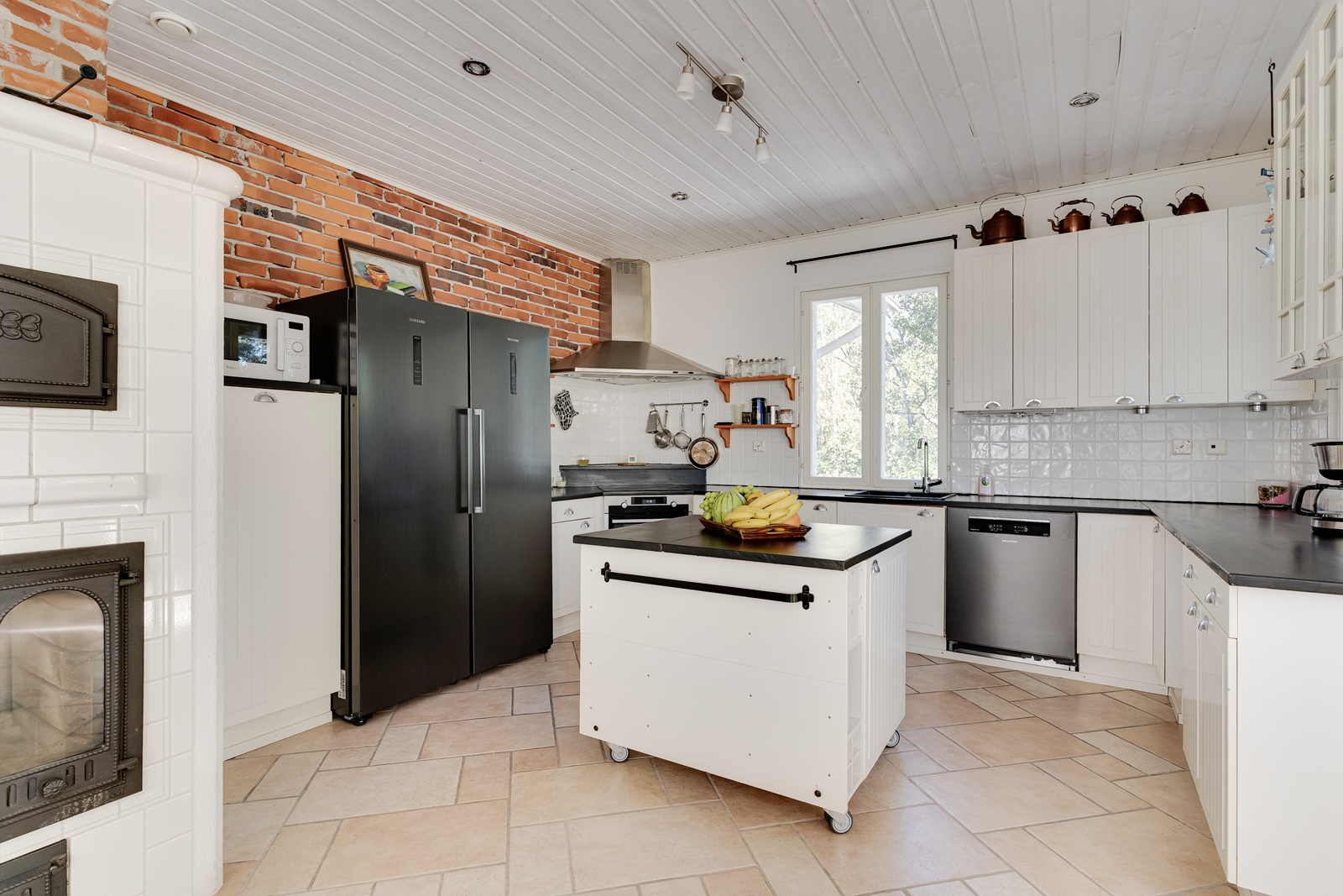 Liesi (Induktioliesi), työtasot (puu), lattiat (laatta), jääkaappi, erillisuuni, astianpesukone, keittiösaareke ja liesi |