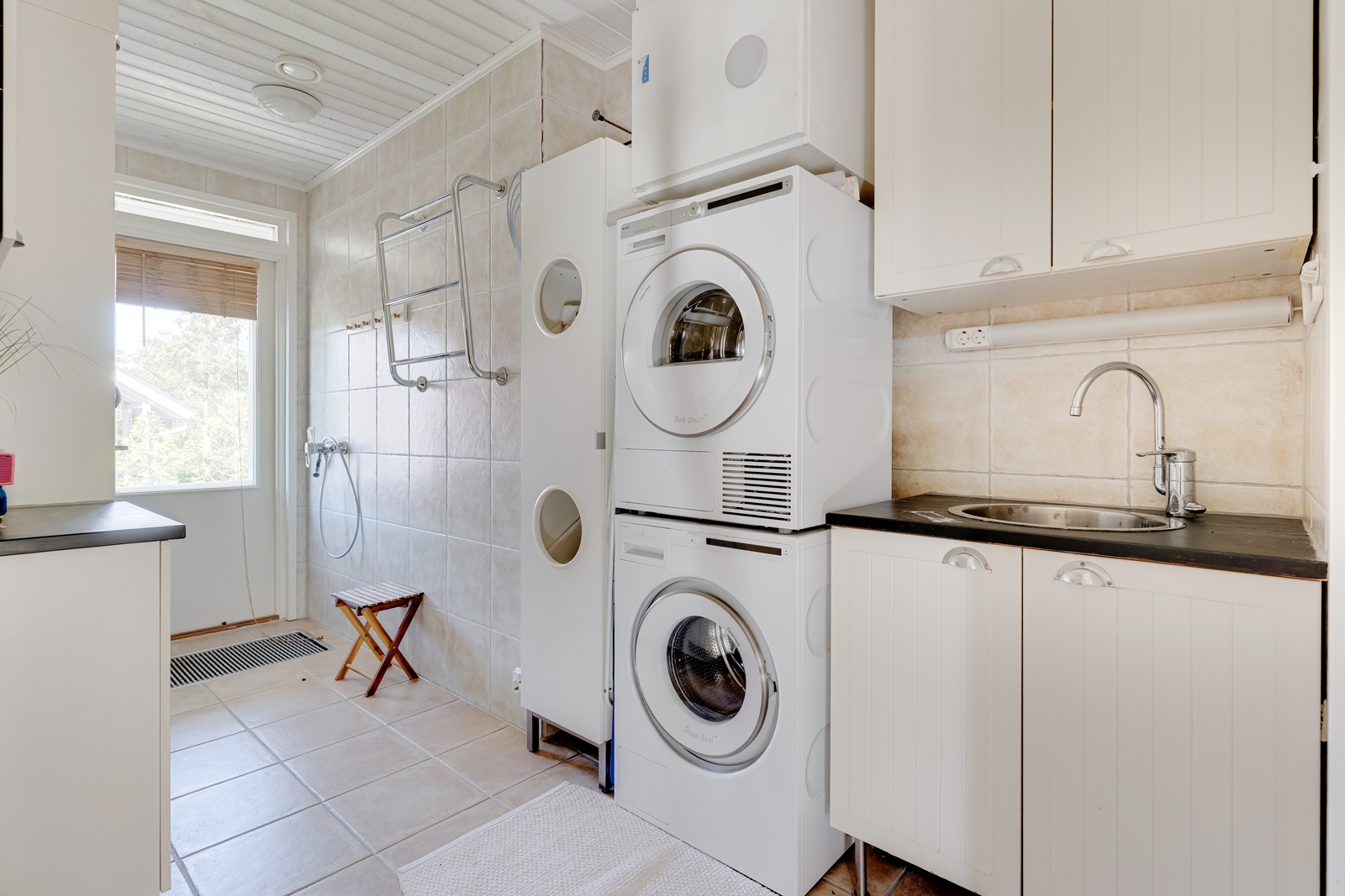 Pesukoneliitäntä, pesuallas, lattialämmitys, kurapiste ja pöytätaso, lattiat (laatta), seinät (kaakeli) |