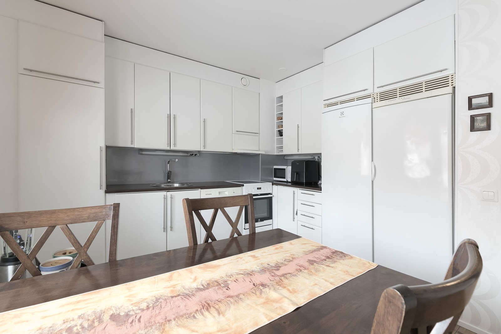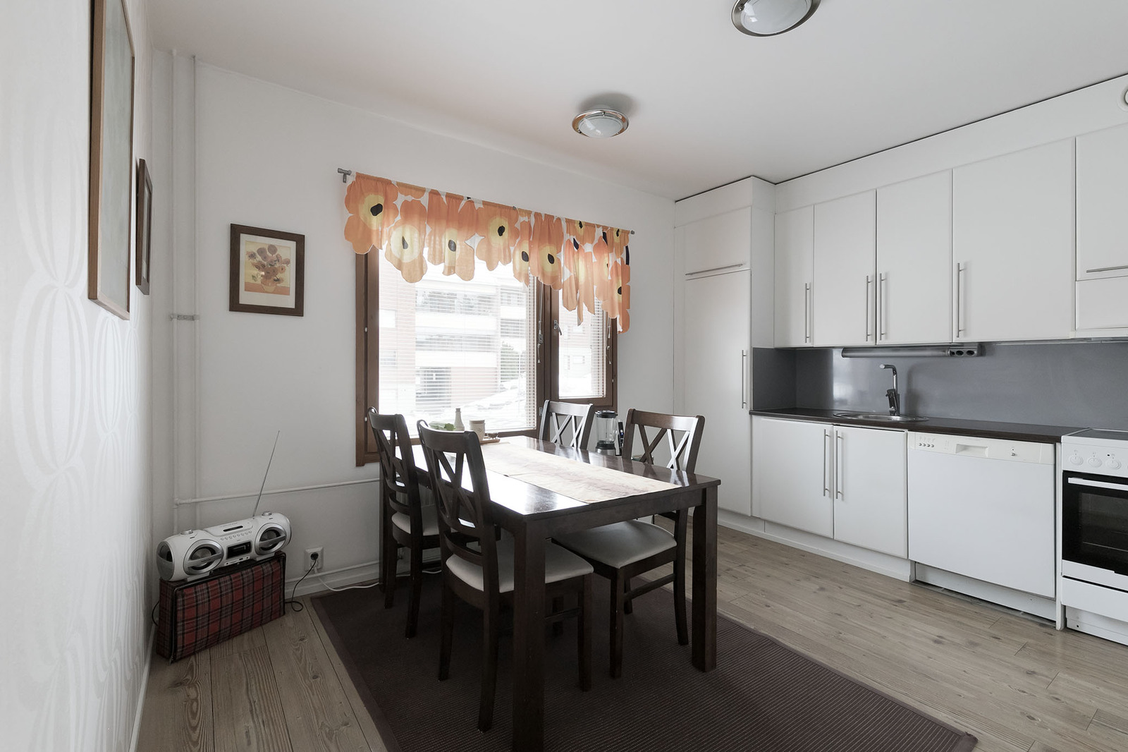 | Keittiön kuvaus | Liesi (Induktioliesi), lattiat (laminaatti), liesi, jääkaappi, astianpesukone ja liesituuletin / hormi, pakastekaappi, kiinteät valaisimet |