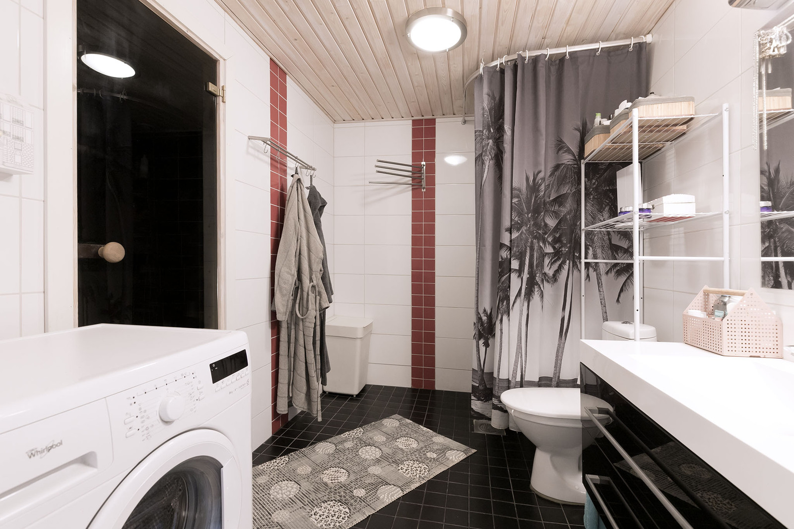 | Kylpyhuoneen kuvaus | Pesukoneliitäntä, wc-istuin, allaskaappi, peili, lattialämmitys, suihku ja kiinteät valaisimet, seinät (kaakeli), lattiat (laatta), Kylpyhuone remontoitu 2009, saunan kiuas uusittu 12/24 |