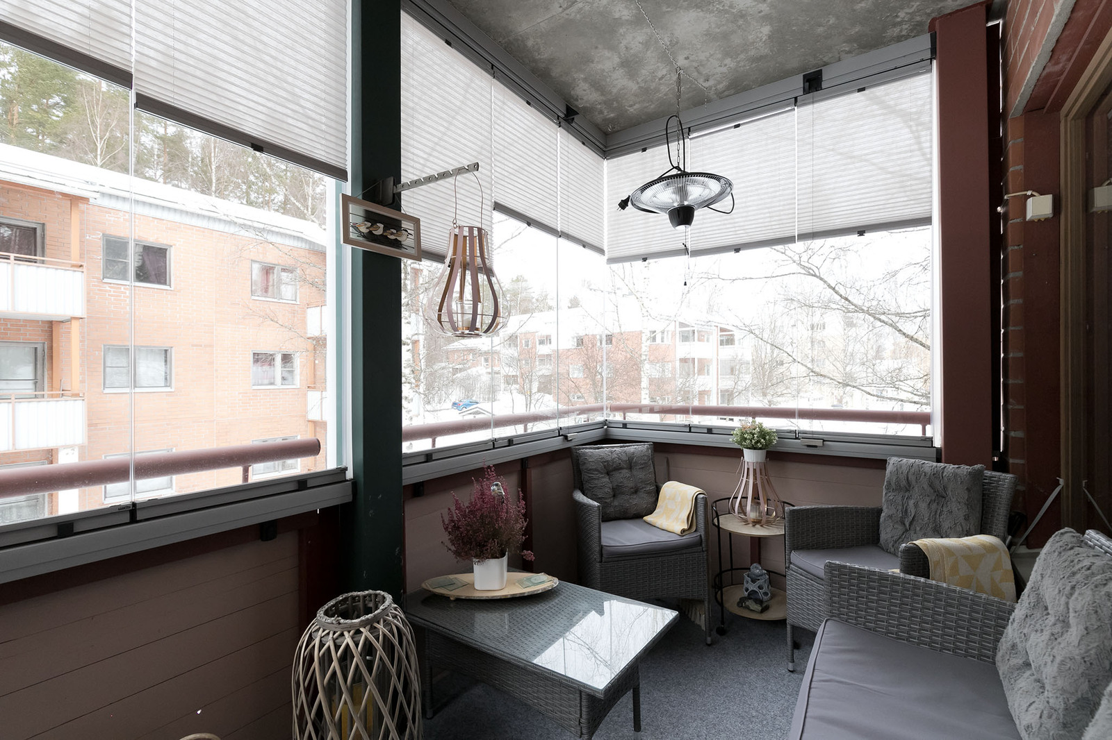 Asunnossa on tilava ja valoisa olohuone, toimiva vaaleansävyinen keittiö, kaksi makuuhuonetta ja oma sauna. Erityisen ihana on tilava lasitettu aurinkosuojakaihtimilla varustettu parveke, joka toimii täydellisenä oleskelupaikkana kesäpäivinä. Hyvin hoidettu taloyhtiö ja rauhallinen ympäristö. Taloyhtiössä on hyvät yhteiset tilat sekä pesutuvan käyttö sisältyy hoitovastikkeeseen.