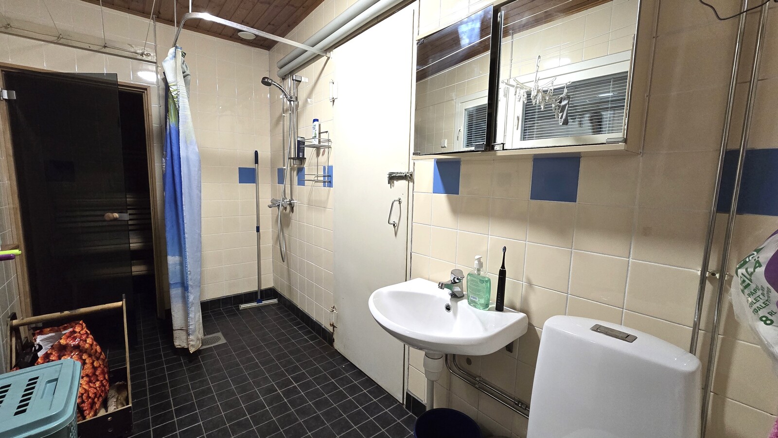 Lattialämmitys, peilikaappi, wc-istuin, suihku ja kiinteät valaisimet, seinät (kaakeli), lattiat (laatta) |