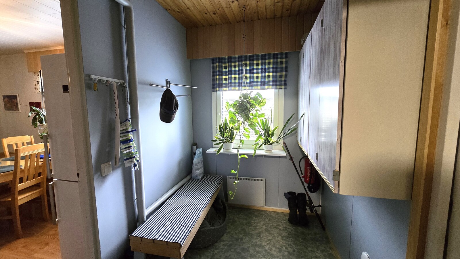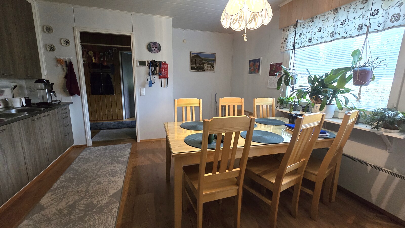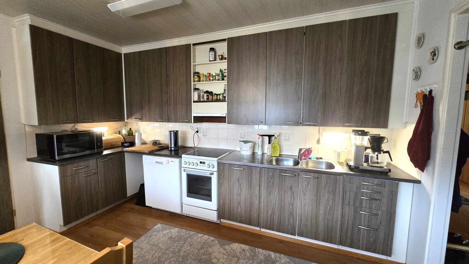 Liesi (Keraaminen liesi), työtasot (laminaatti), seinät (maali), lattiat (laminaatti), astianpesukone, jääkaappipakastin, liesituuletin ja kiinteät valaisimet |