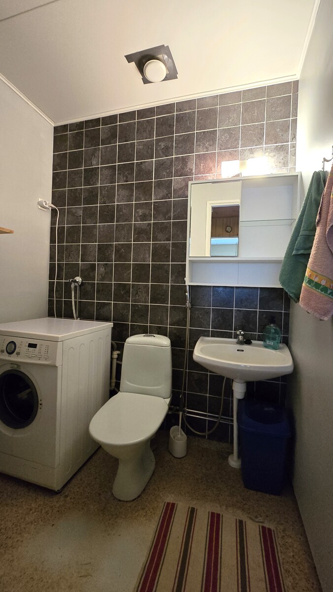 Lukumäärä: 1, Pesukoneliitäntä ja peilikaappi, seinät (Osalaatoitus ja maali), lattiat (Muovimatto) |