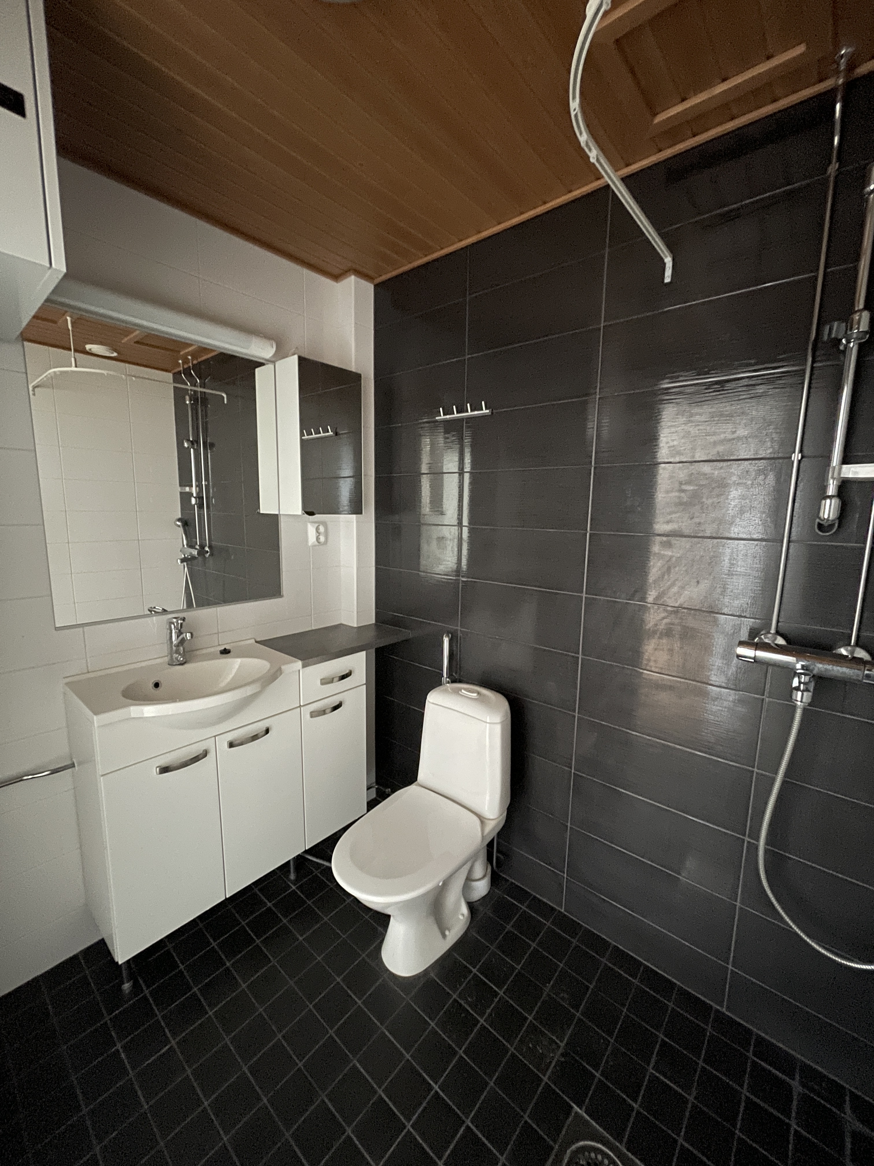 | Kylpyhuoneen kuvaus | WC-istuin, suihku, suihkuseinä, peilikaappi, allaskaappi, pesukoneliitäntä ja bidee-suihku, seinät (kaakeli), lattiat (laatta) |