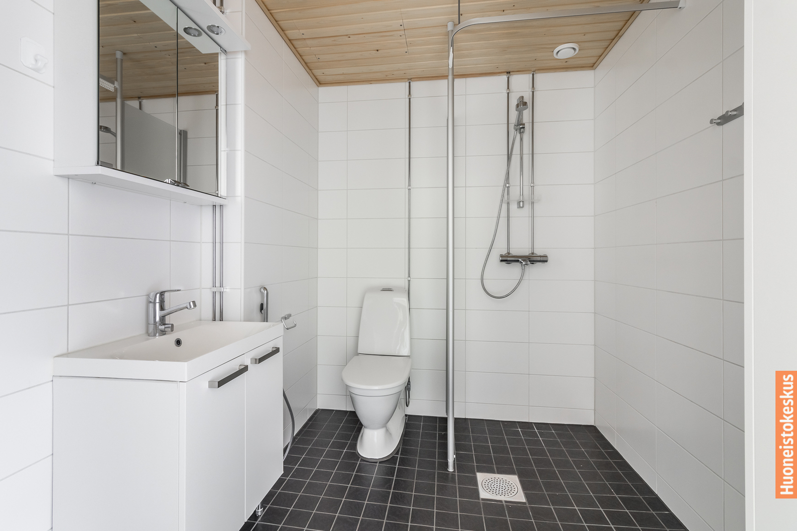 Suihku, wc-istuin, lattialämmitys, peilikaappi, pesukoneliitäntä, suihkuseinä, bidee-suihku ja allaskaappi, seinät (kaakeli), lattiat (laatta) |