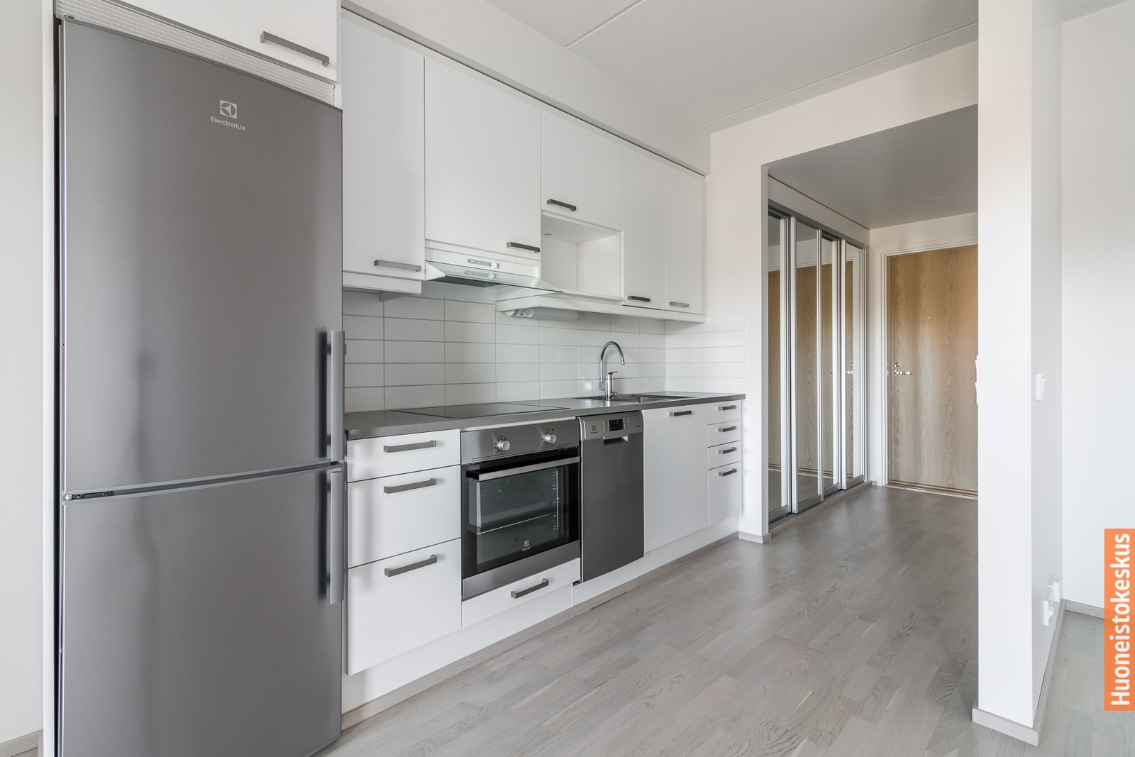 Lattiat (parketti), erillisuuni (rosteri), jääkaappipakastin (rosteri), astianpesukone (rosteri), liesituuletin ja liesitaso |