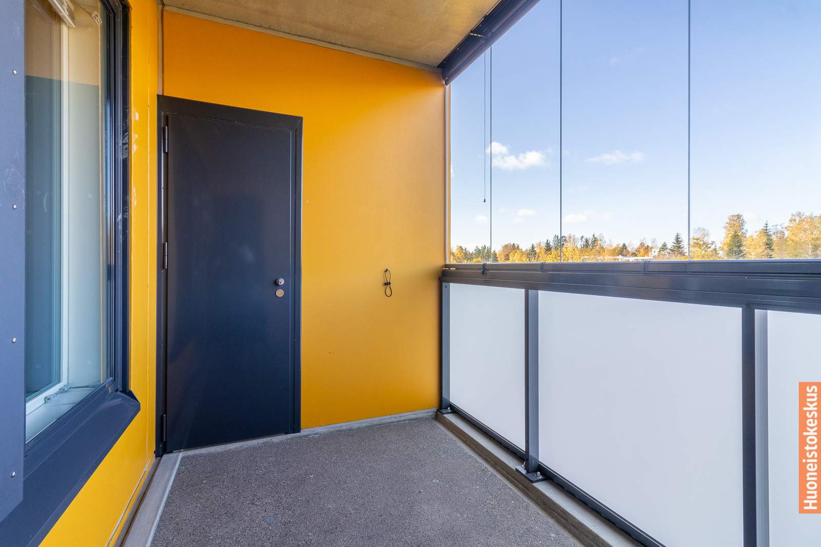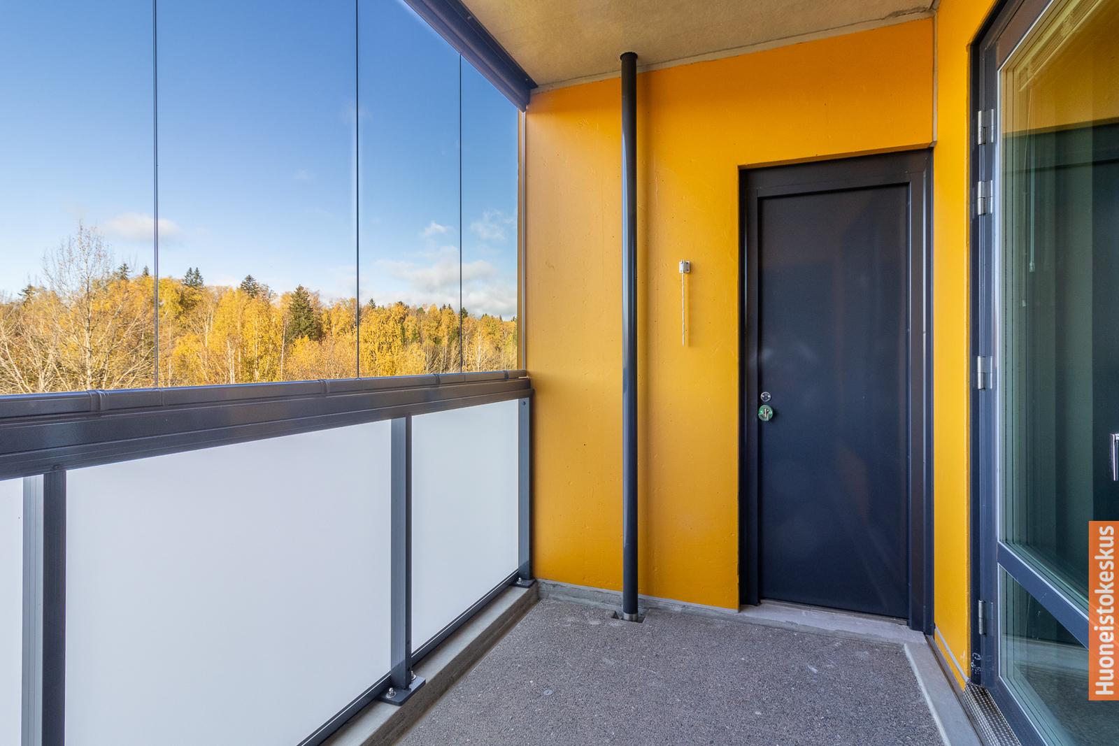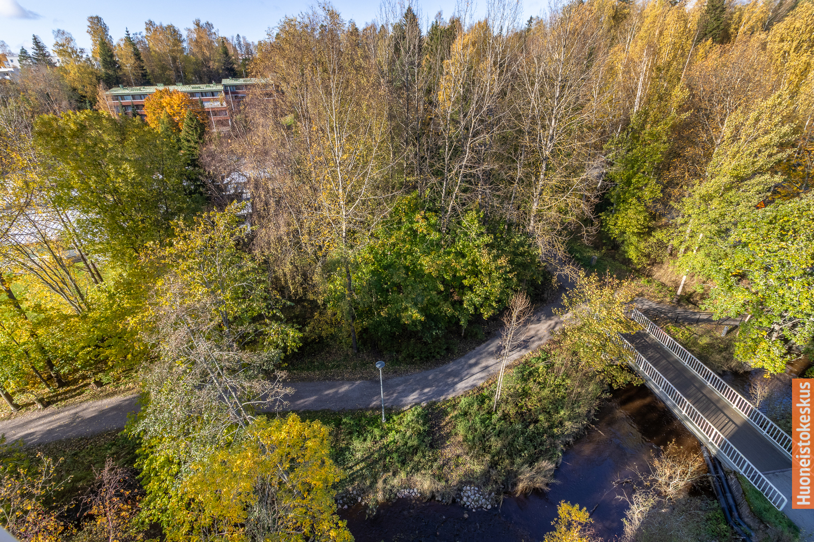 Toimiva keittiö yhdistyy tilavaan olohuoneeseen, jossa on syvennys esim. makuutilalle. Laatoitettu tyylikäs kylpyhuone. Lasitettu parveke avautuu länteen, idyllisin näkymin. Ihastele luontoa, kuuntele puron solinaa tai katsele Ankkapuiston tapahtumia, korkealta ja kauas.