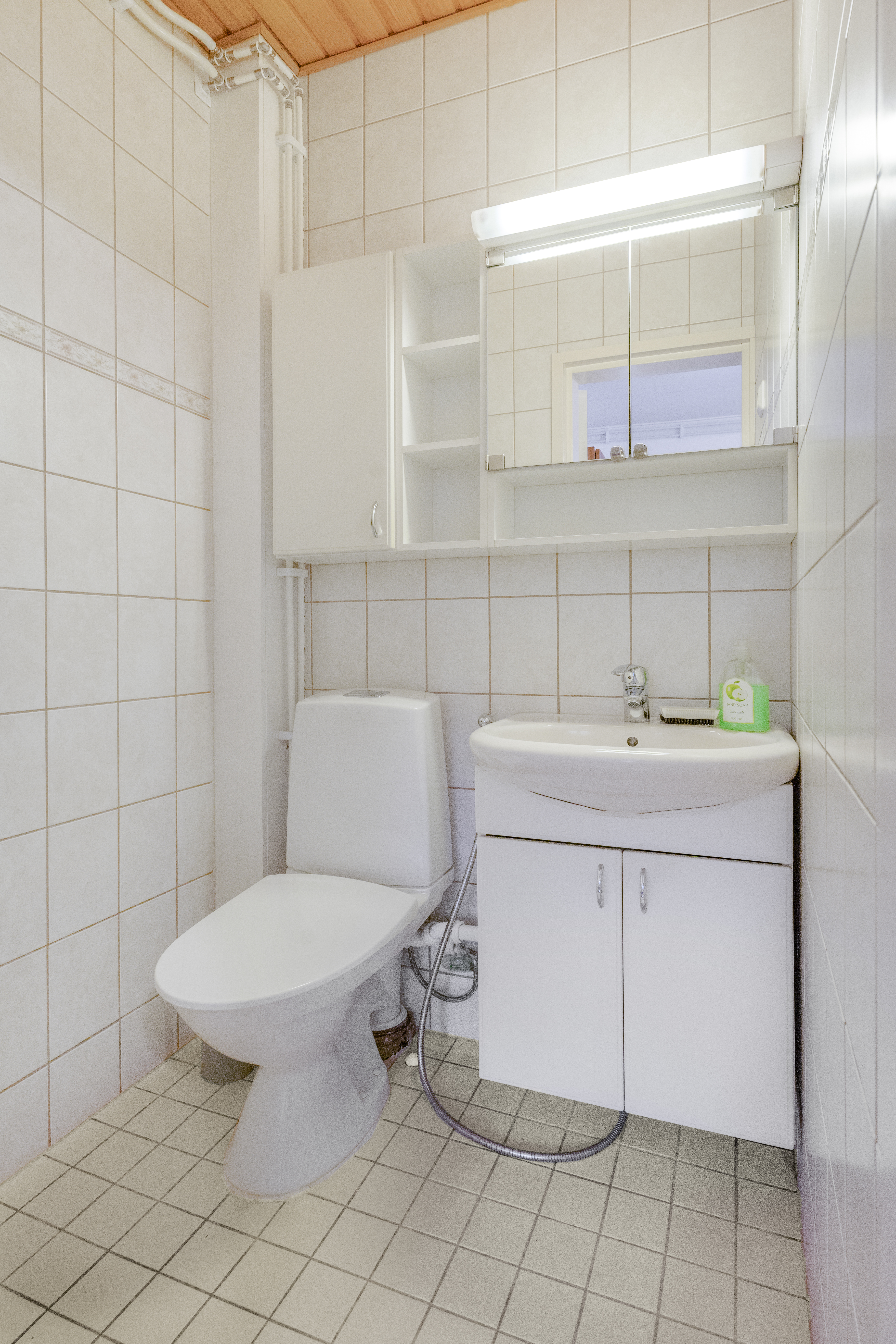Lukumäärä: 1, WC-istuin, bidee-suihku, peilikaappi ja allaskaappi, seinät (Kaakeli), lattiat (Laatta) |