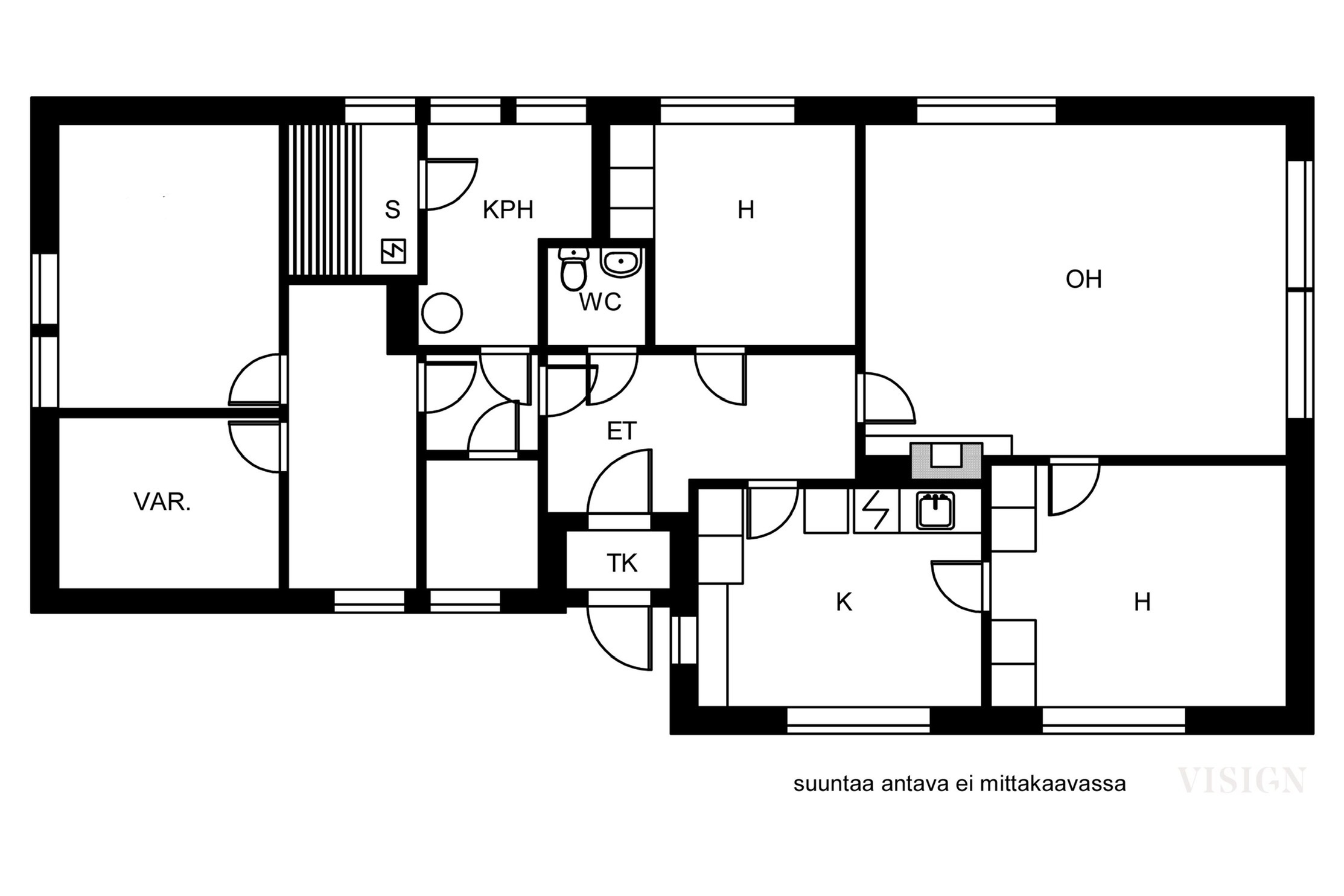 Ei tarkistusmitattu, joten voi poiketa olennaisestikin ilmoitetusta. Pinta-ala otettu alkuperäisen pohjapiirroksen ilmoitetusta rakennusalasta.. Tarkistusmitattu: Ei |