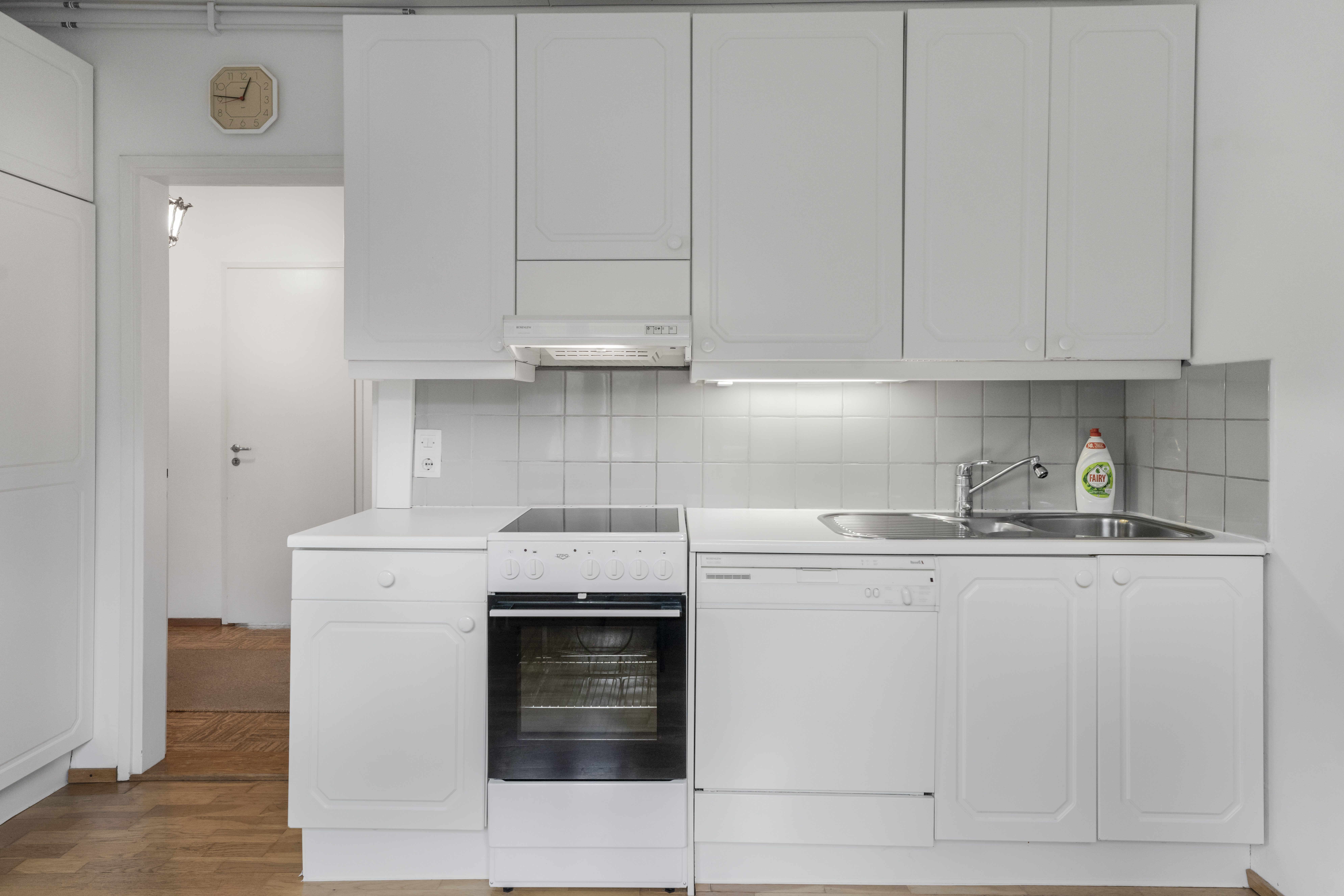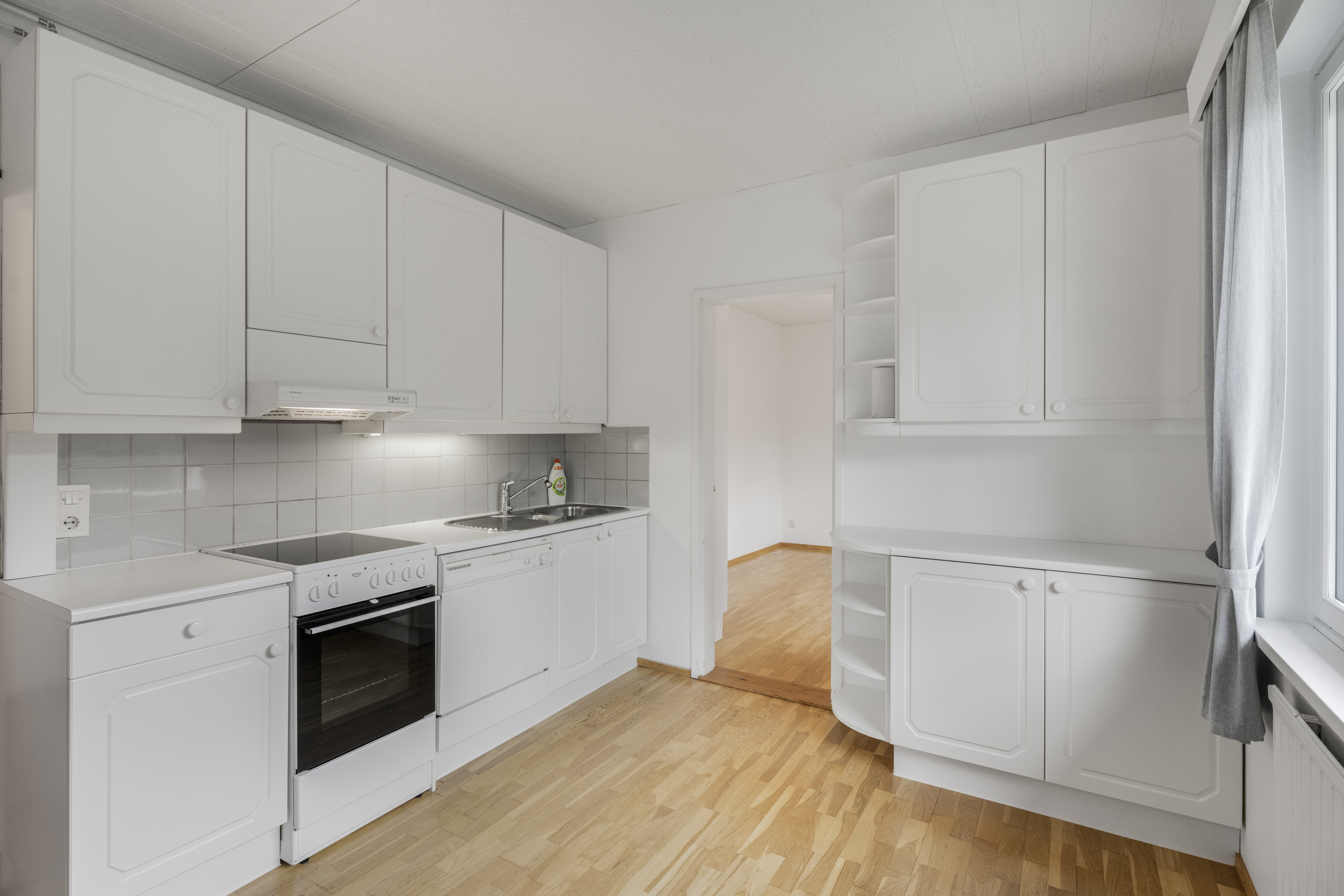 Liesi (Keraaminen liesi), työtasot (laminaatti), seinät (maali), lattiat (parketti), jääkaappipakastin |
