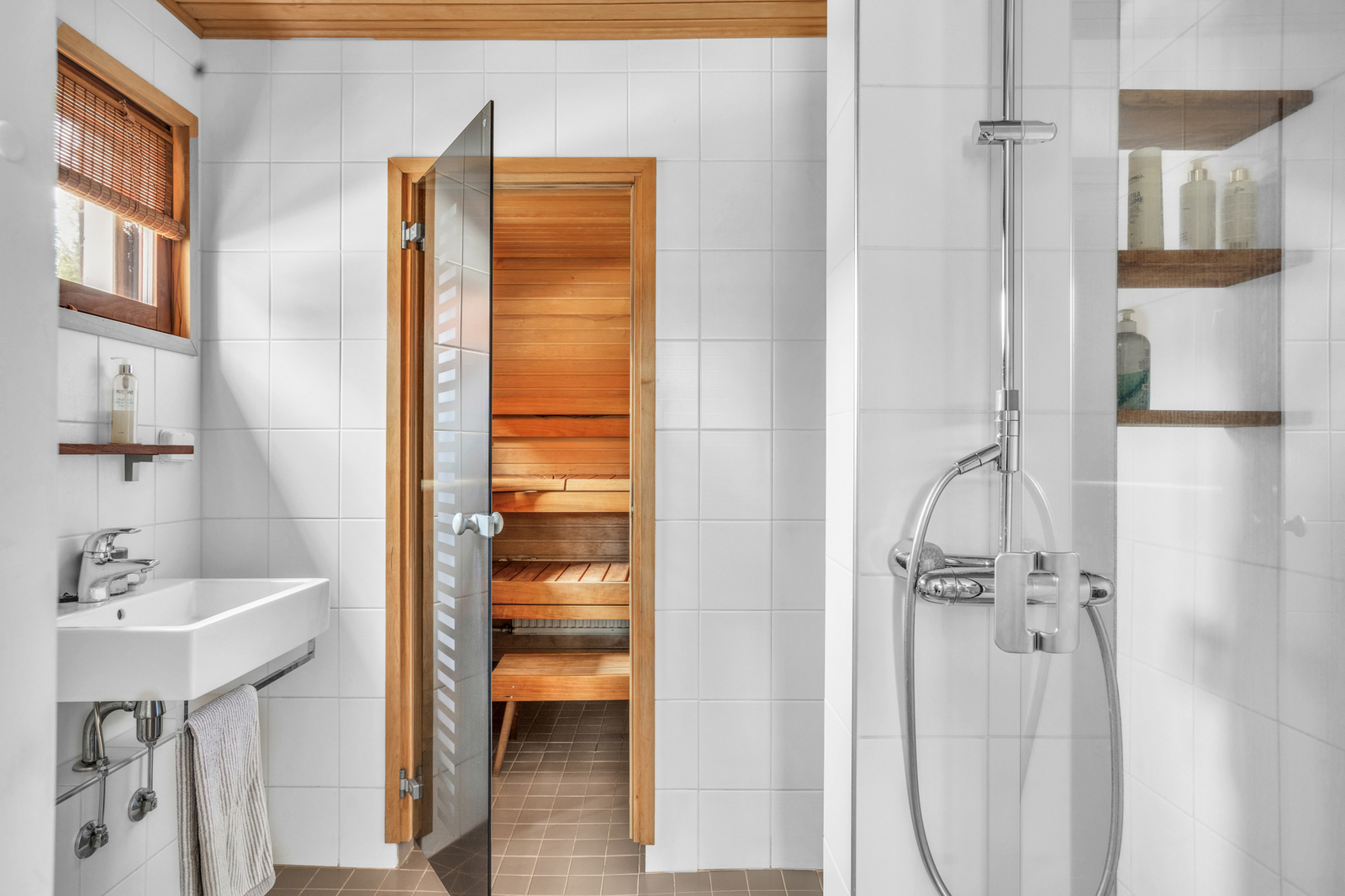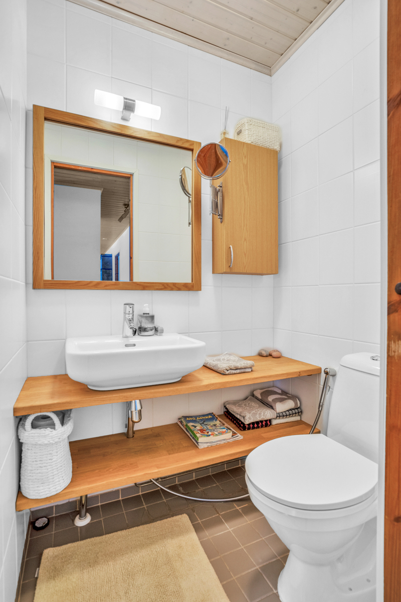 Lattialämmitys, wc-istuin, suihku ja kiinteät valaisimet, seinät (kaakeli), lattiat (laatta) |