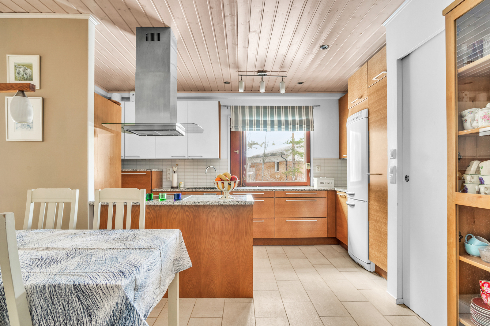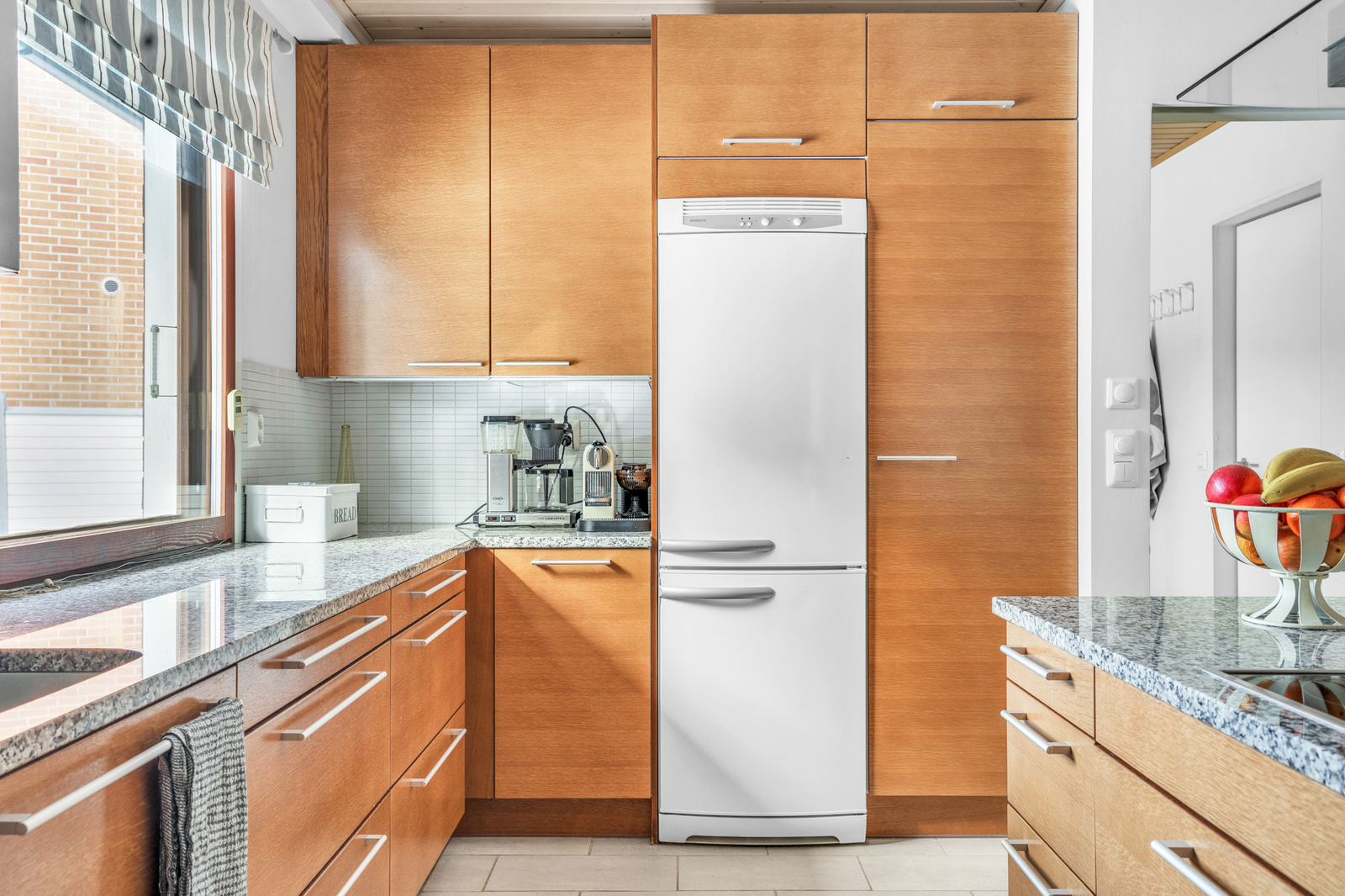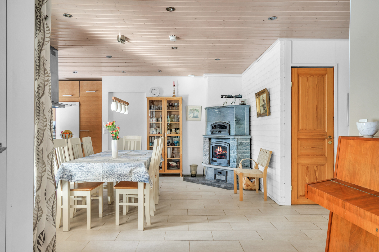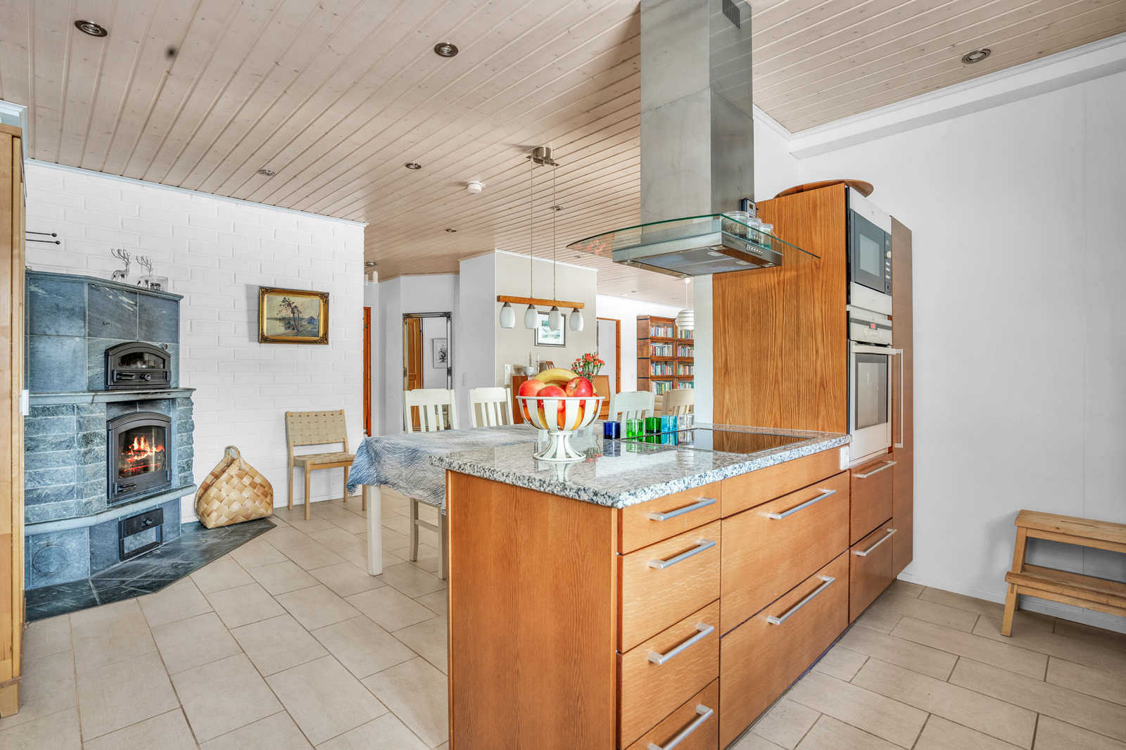 Liesi (integroitu, liesitaso), työtasot (kivi), seinät (maali), lattiat (laatta), astianpesukone, jääkaappipakastin, mikroaaltouuni ja kiinteät valaisimet, liesitaso, liesituuletin / hormi |