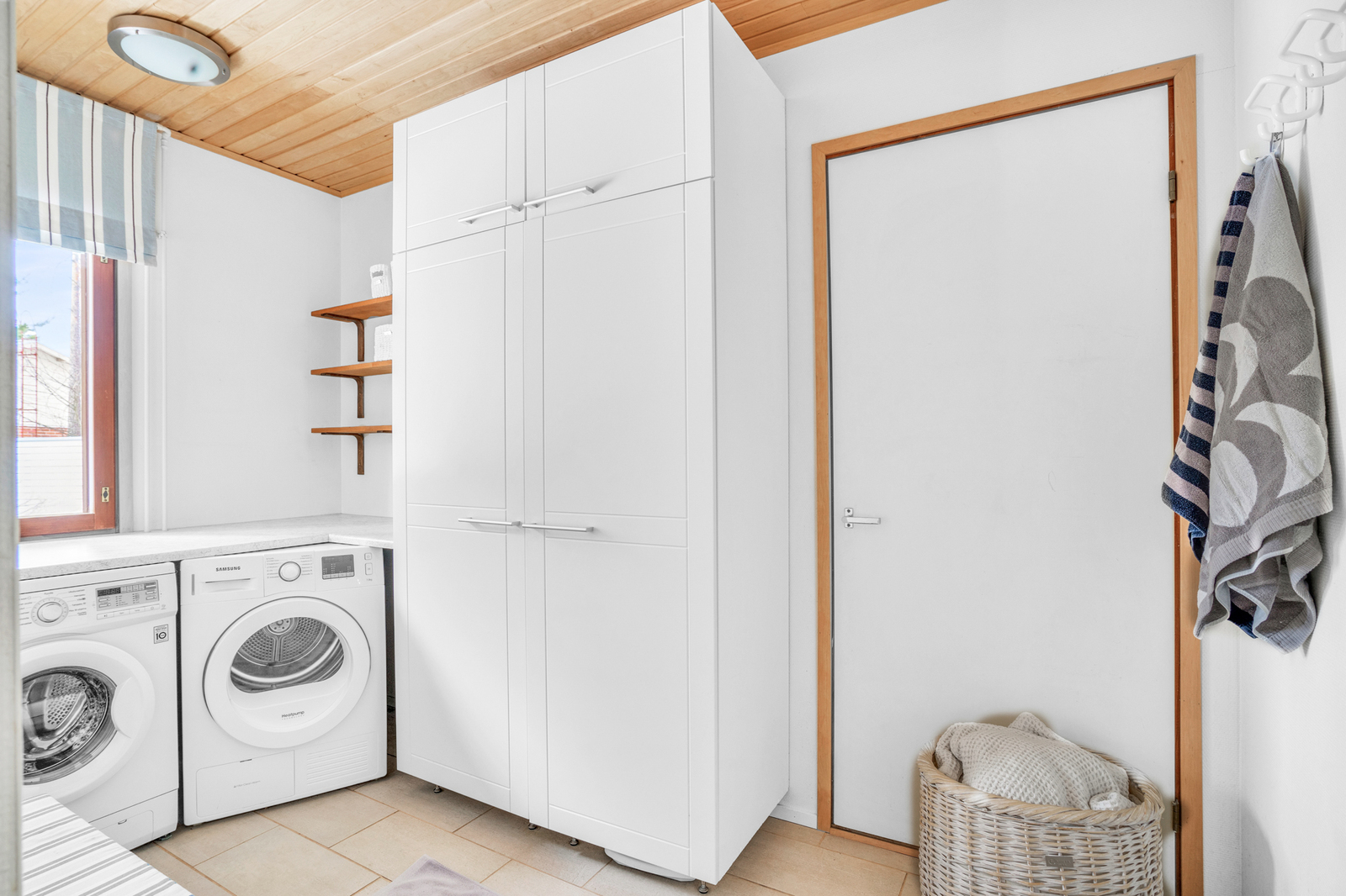 Pesukoneliitäntä ja lattialämmitys, lattiat (laatta), seinät (maali), kaapistot. |