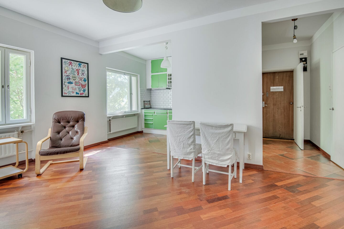 Heti vapaa, toisen kerroksen kaksio, josta läpitalon huoneiston kaikki näkymät yhtiön vehreälle sisäpihalle.