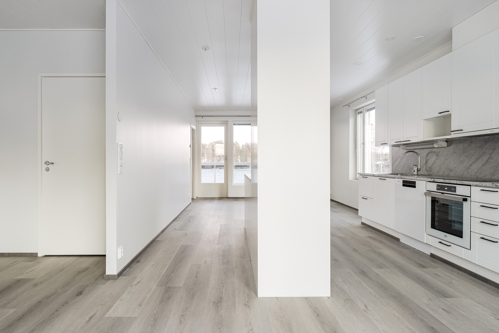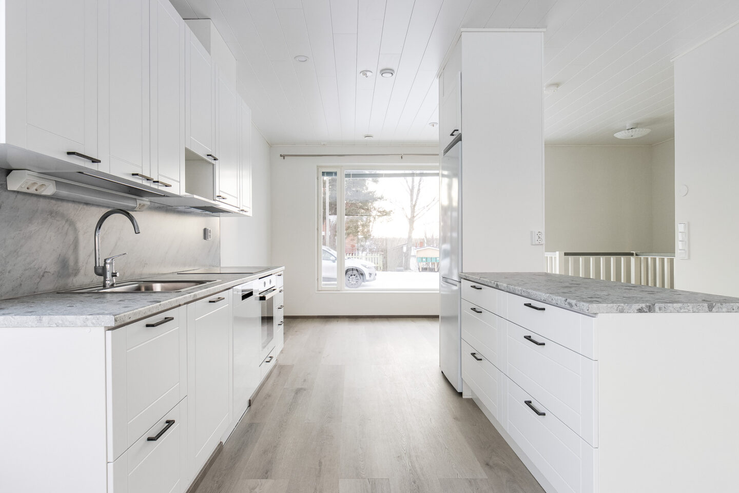 | Keittiön kuvaus | Liesi (Induktioliesi ja erillisuuni), seinät (maali), lattiat (laminaatti), liesi, astianpesukone, erillisuuni, jääkaappi, erillinen pakastin, liesituuletin ja kiinteät valaisimet, – kodinkoneet UPO – parvekelasitukset Lumon – kalusteet Hempan kaluste |