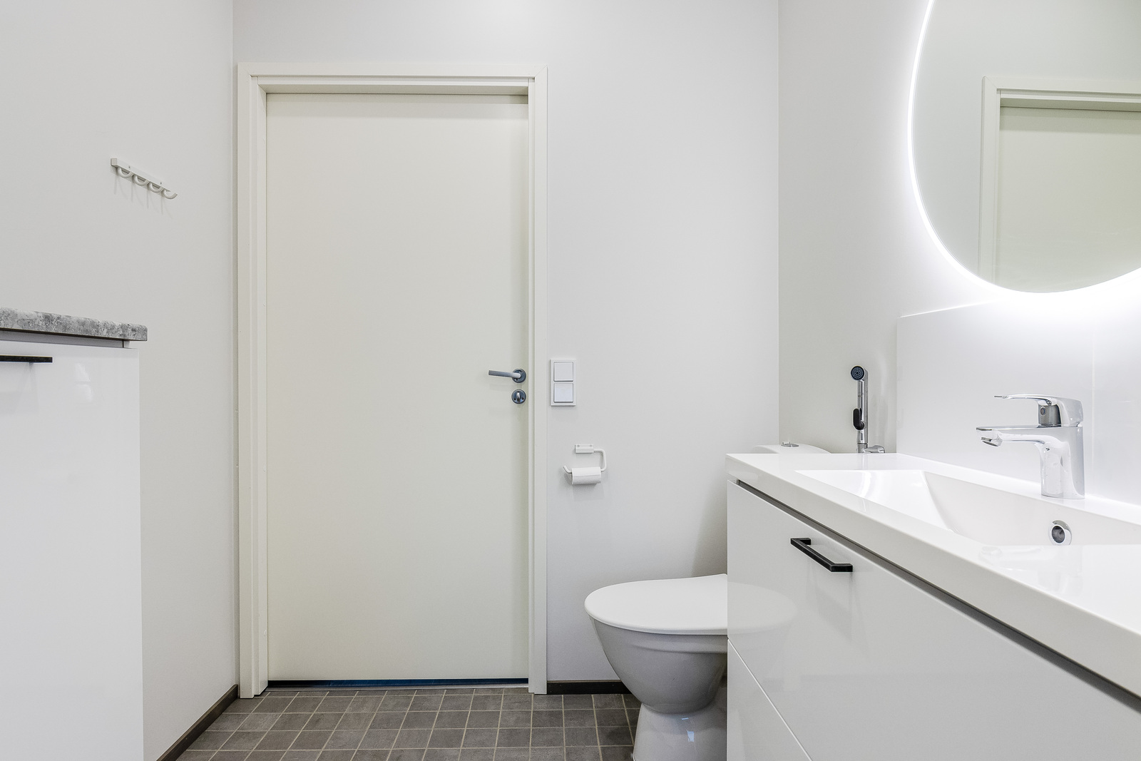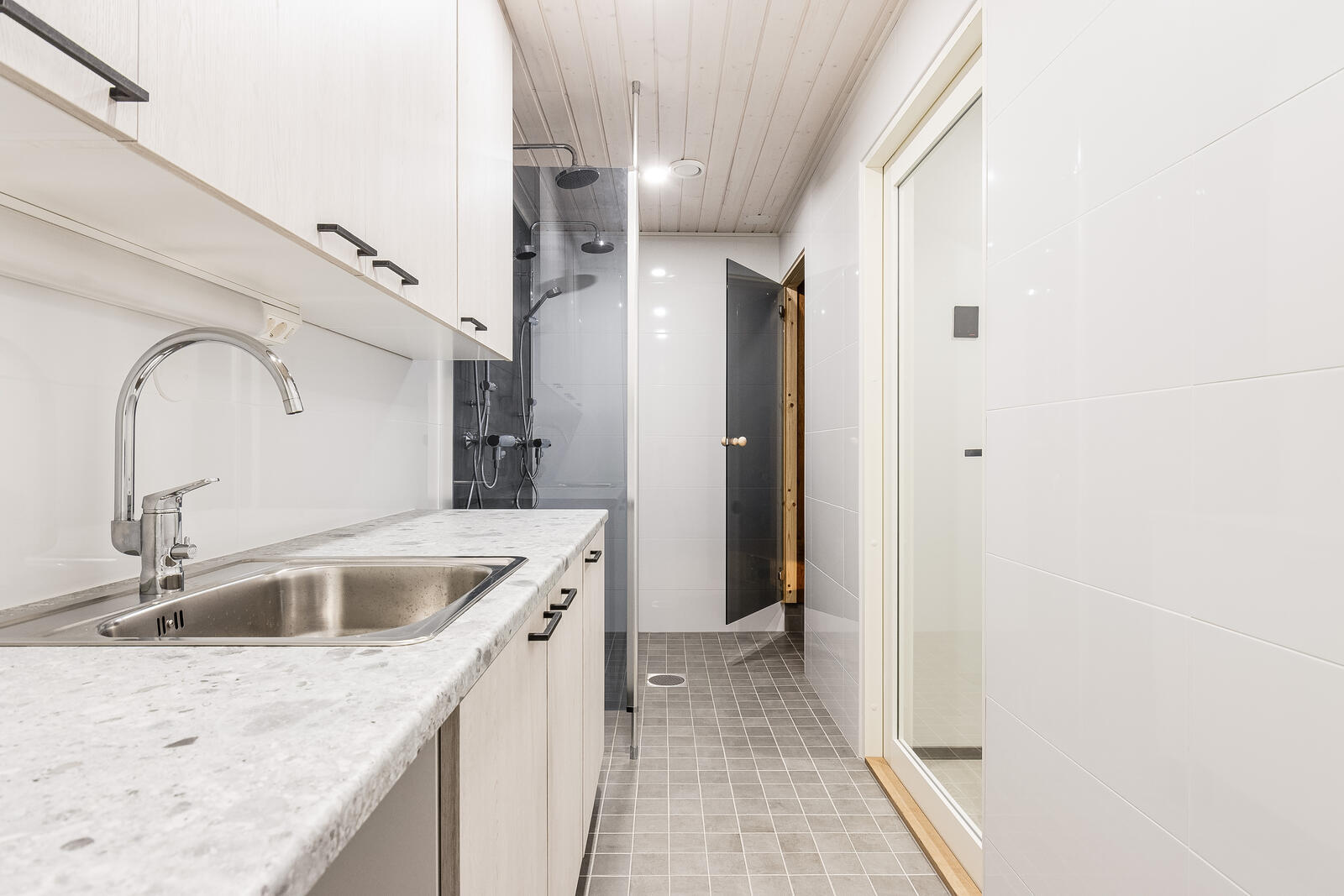 | Kylpyhuoneen kuvaus | Pesukoneliitäntä, lattialämmitys, allaskaappi, suihku, wc-istuin ja kiinteät valaisimet, seinät (kaakeli), lattiat (laatta) |