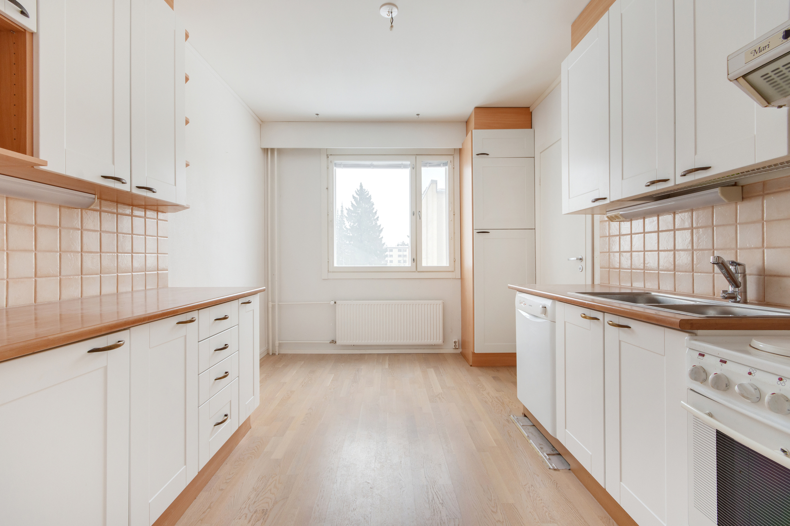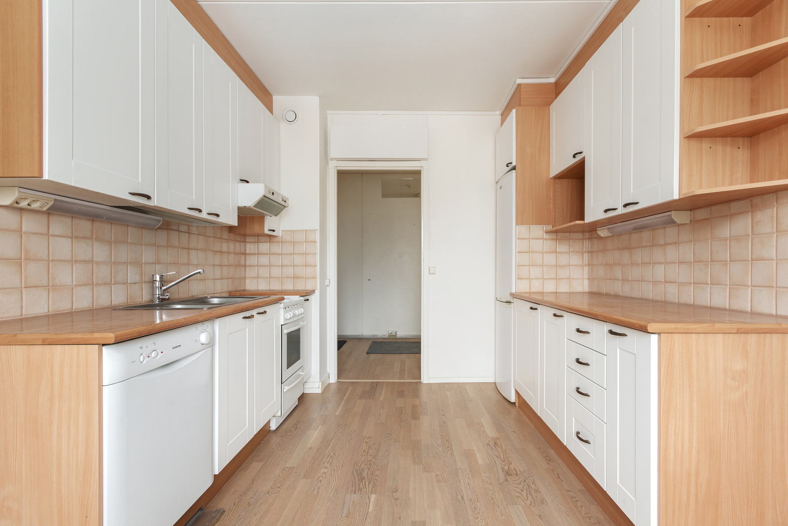 | Keittiön kuvaus | Liesi (sähköliesi), työtasot (laminaatti), seinät (laatta ja lasikuitutapetti), lattiat (parketti), astianpesukone, liesi, jääkaappipakastin ja liesituuletin |