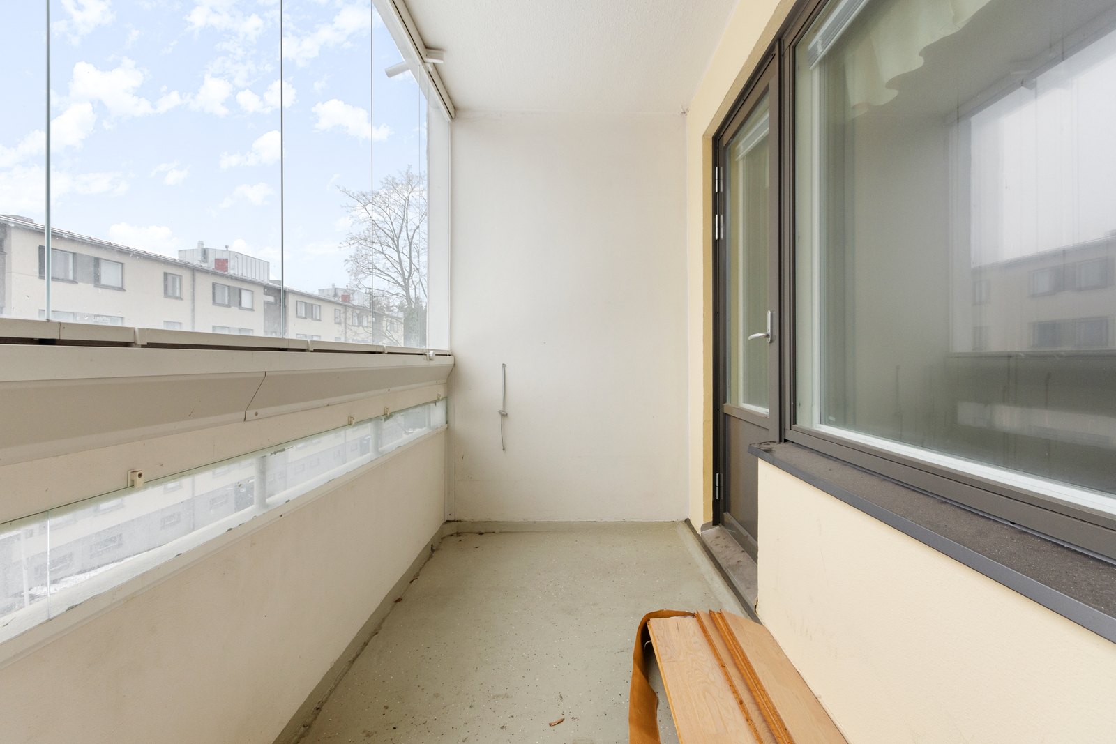 Lasitettu parveke etelään – valoisa ja viihtyisä tila aamukahville tai ilta-auringosta nauttimiseen.