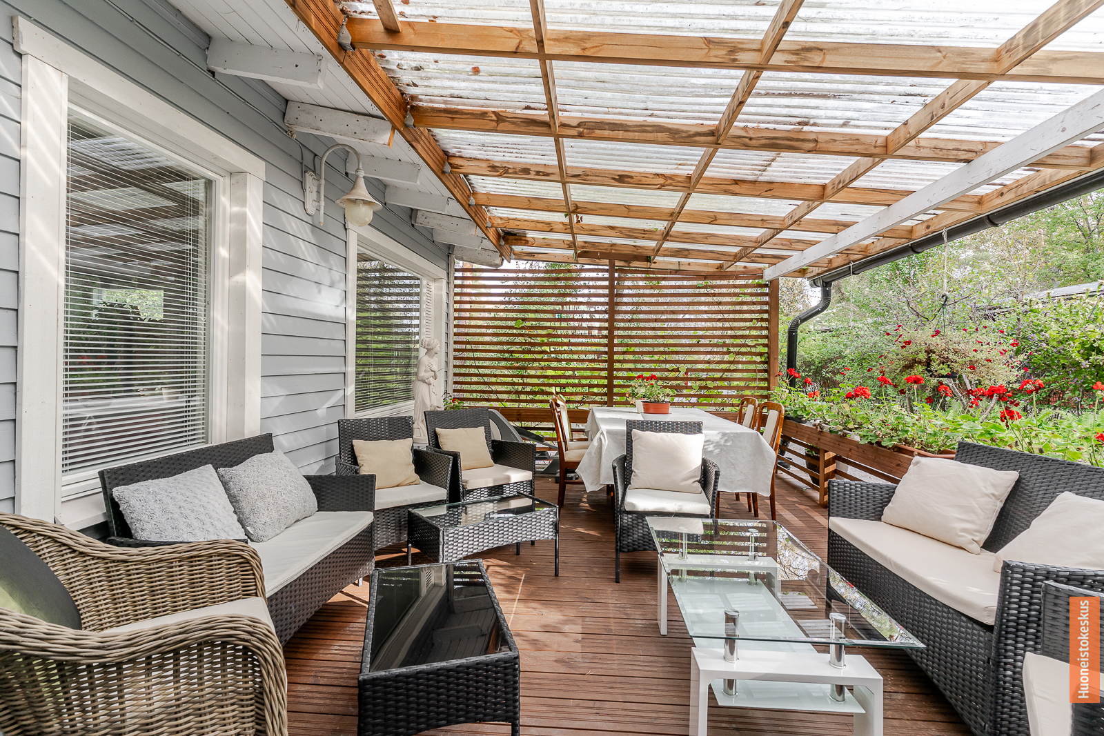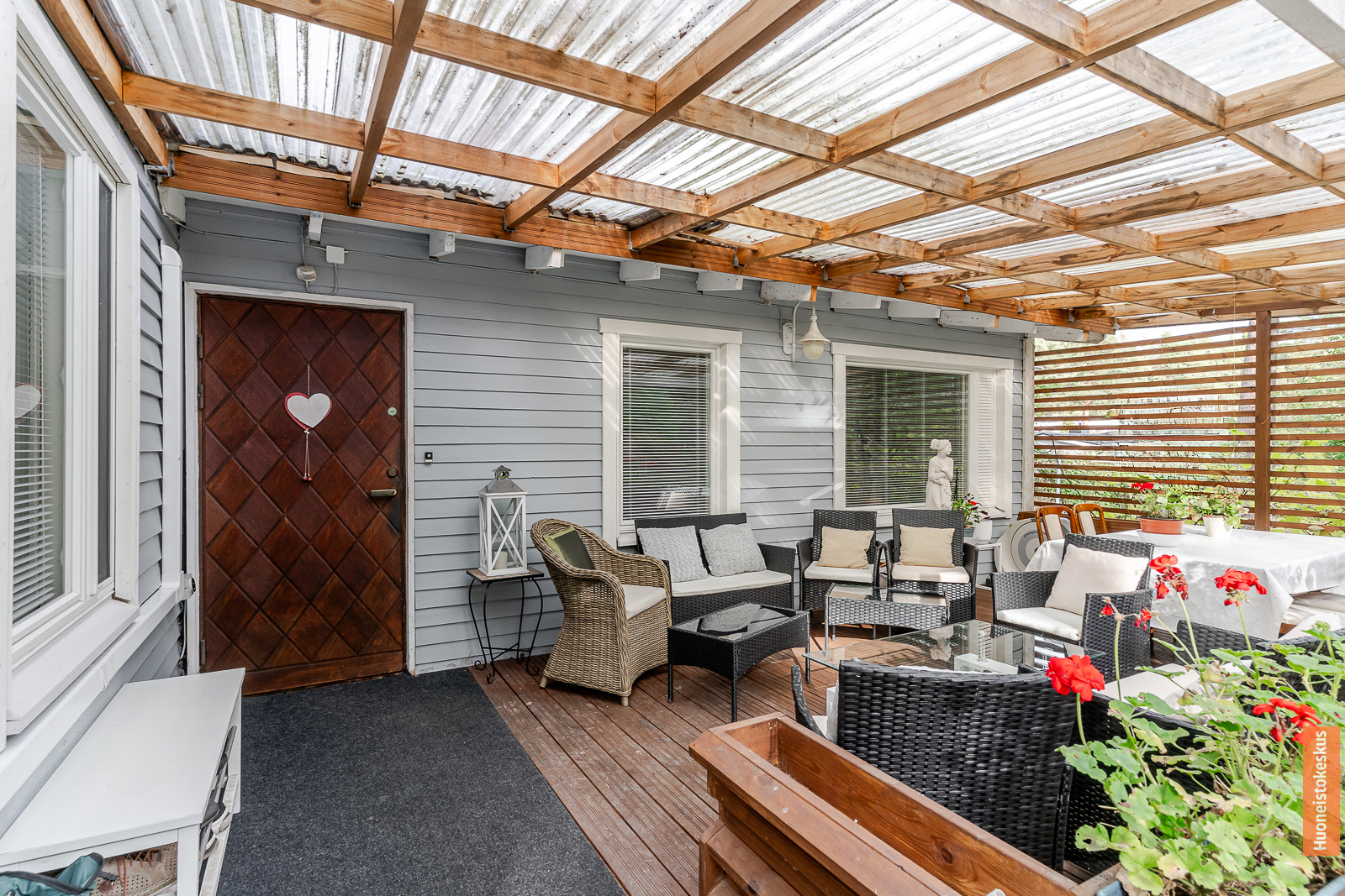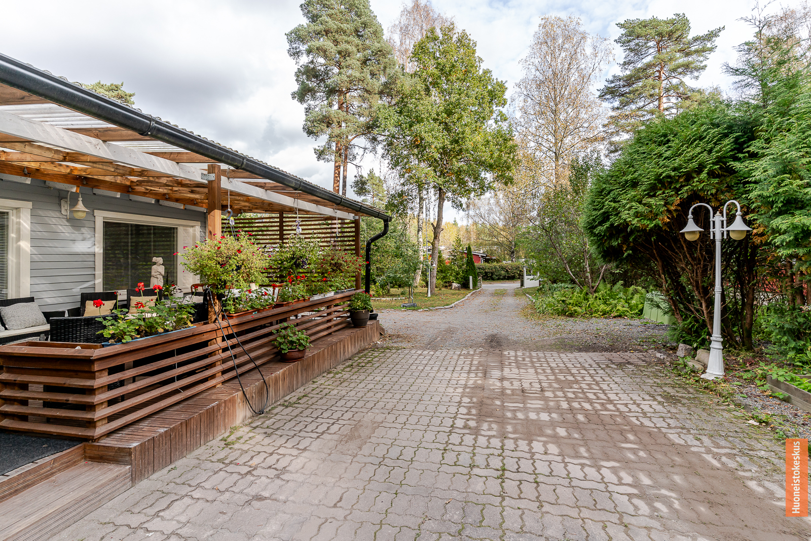 Keittiö on varustettu nykyaikaisilla laitteilla, kuten erillisellä uunilla ja astianpesukoneella. Kylpyhuoneessa ja saunassa on sähköinen lattialämmitys, mikä lisää mukavuutta etenkin talvisin. Lisäksi tilava katettu terassi tarjoaa erinomaiset puitteet ulkoilmaelämästä nauttimiseen.