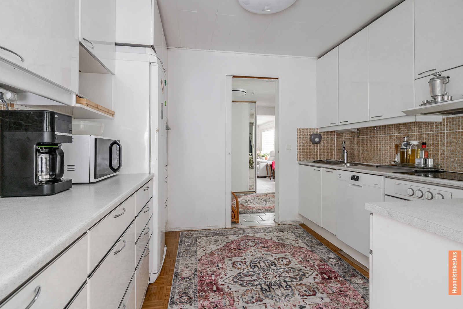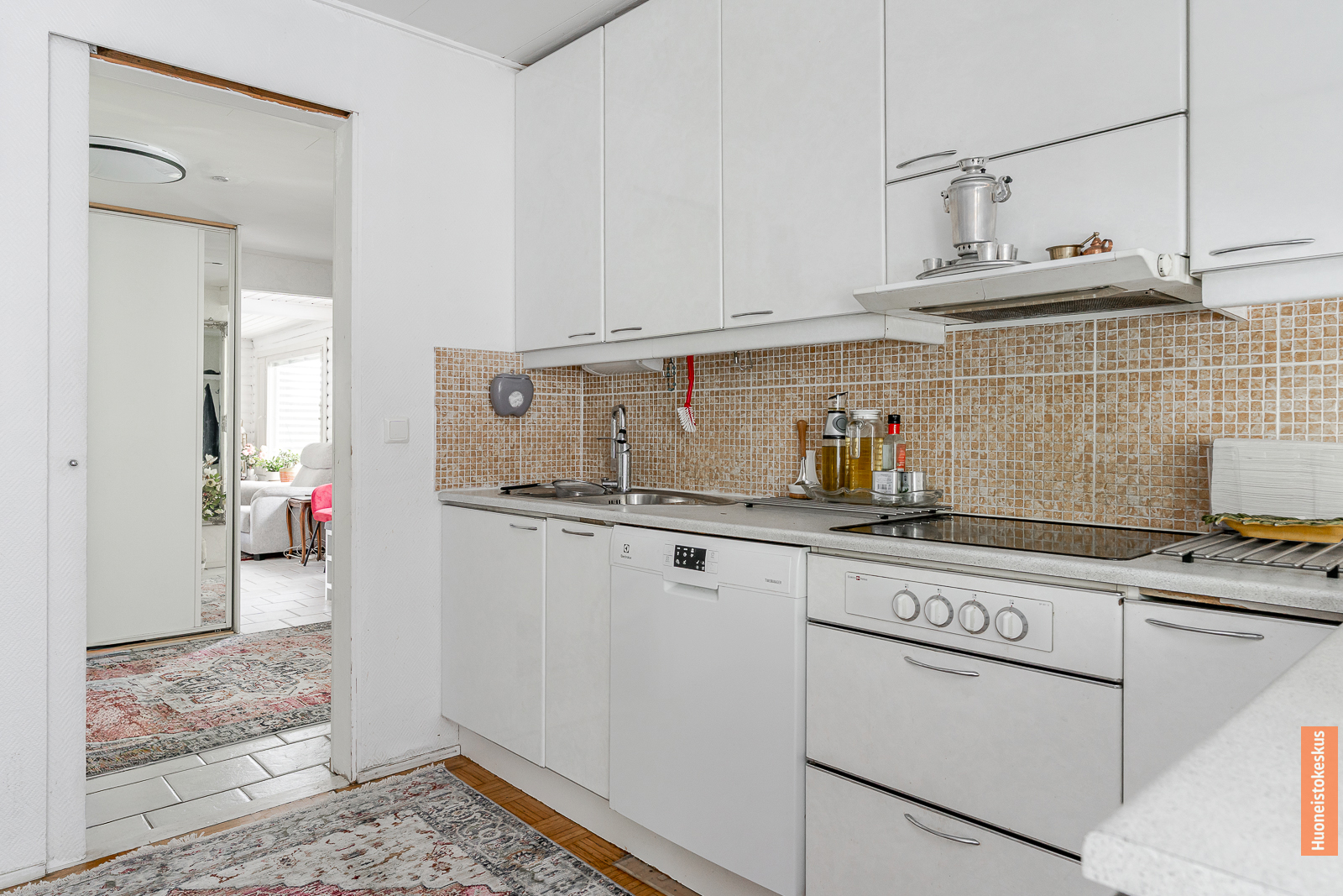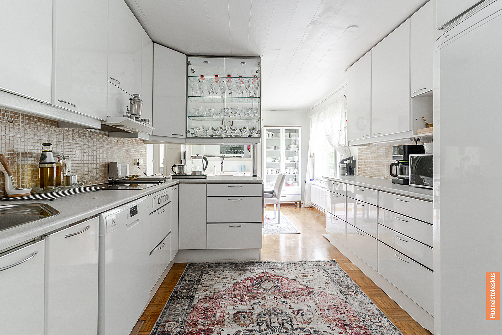 Liesi (Keraaminen liesi), työtasot (laminaatti), lattiat (parketti), jääkaappi (pitkä), astianpesukone (n 4 v), erillisuuni (n 5 v) ja liesituuletin |