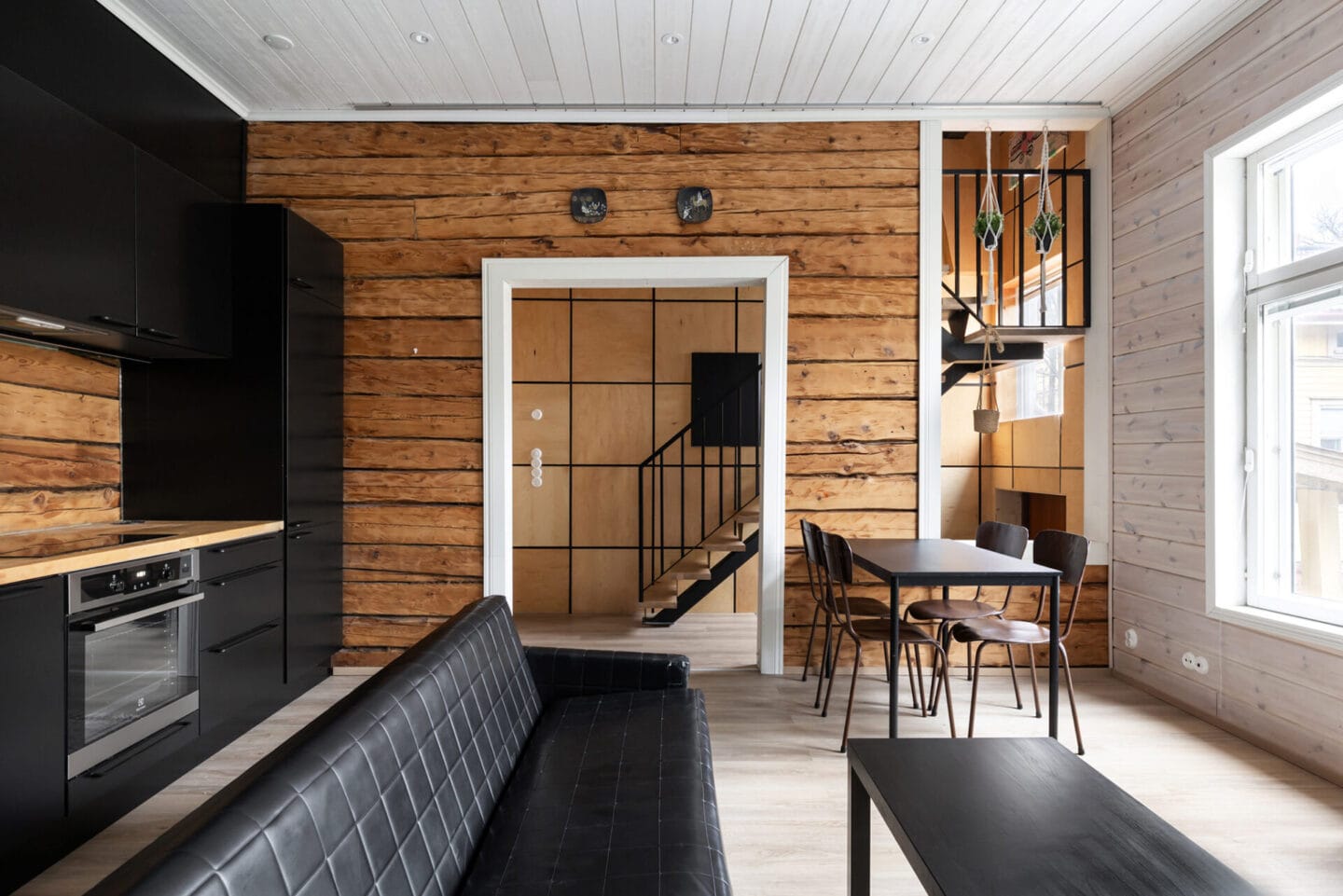 Tässä hurmaavassa kodissa vanhat esiin jätetyt hirret ja yläkerran kattoparrut kertovat rakennuksen pitkästä historiasta, kun taas mattamusta, integroiduin kodinkonein varusteltu keittiö ja lasilla suojatut hirret tuovat sisustukseen modernia eleganssia. Puun lämmin sävy toistuu kaikkialla – niin vanhassa hirressä kuin uusissa seinälevyissä, luoden harmonisen ja kodikkaan kokonaisuuden.