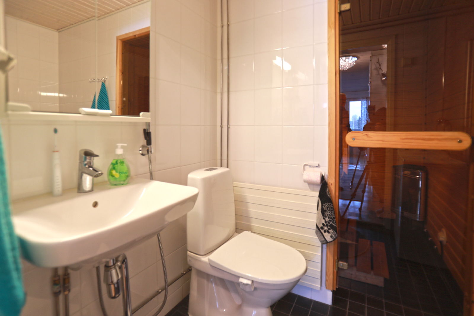 Peilikaappi, suihkuseinä, pesukone, wc-istuin, suihku, pesukoneliitäntä ja kiinteät valaisimet, seinät (kaakeli), lattiat (laatta) |