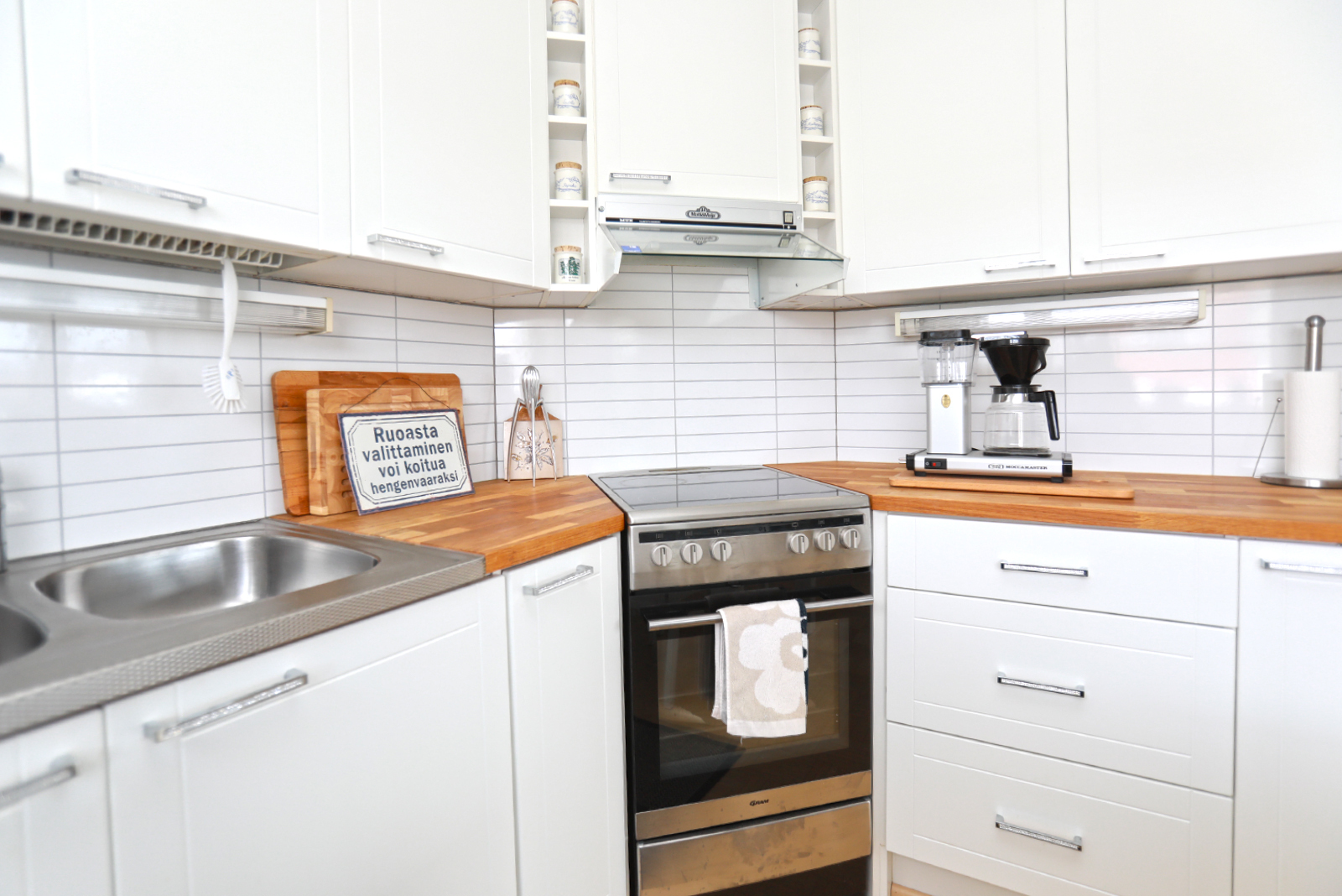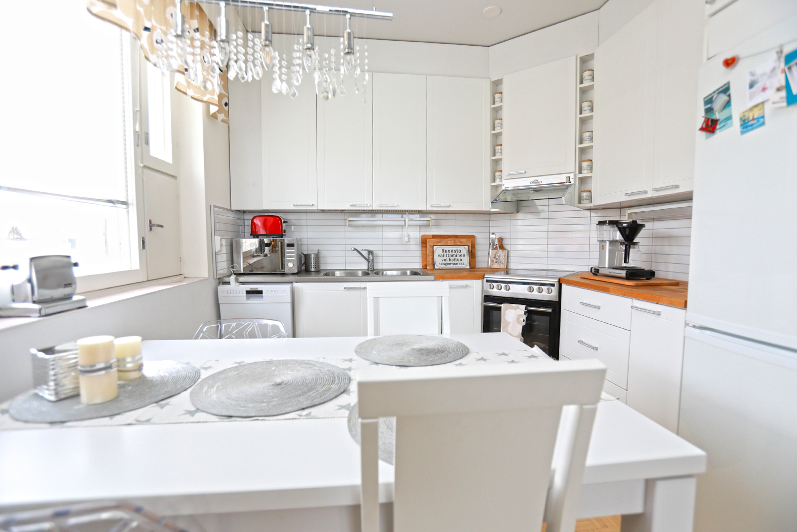 Liesi (Keraaminen liesi), työtasot (laminaatti), seinät (tapetti ja maali), lattiat (parketti), mikroaaltouuni, jääkaappipakastin, liesituuletin, astianpesukone ja kiinteät valaisimet |