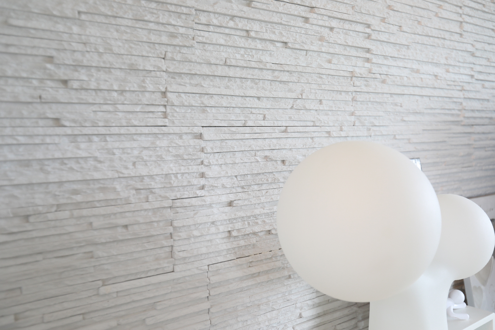 Olohuoneen ja eteisen seinissä koristekiveä |