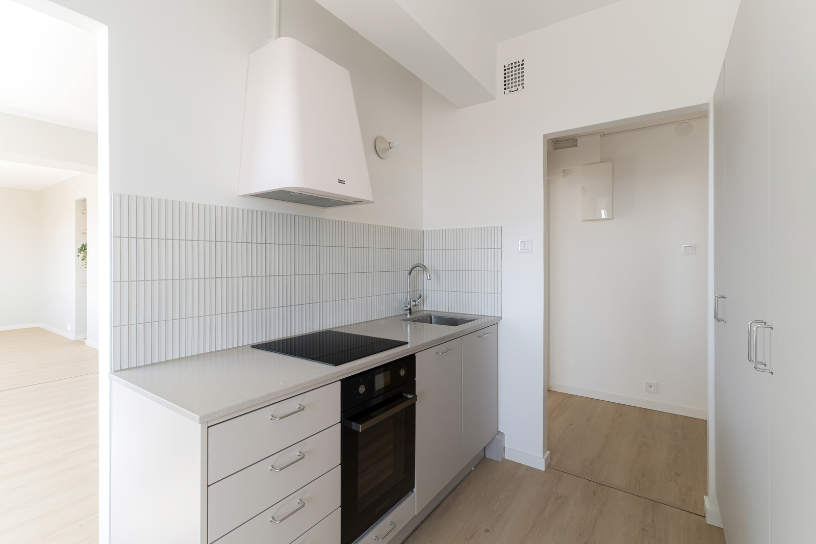 | Keittiön kuvaus | Liesi (Induktioliesi), seinät (maali), lattiat (vinyylikorkki), liesituuletin, liesi, astianpesukone ja kiinteät valaisimet |