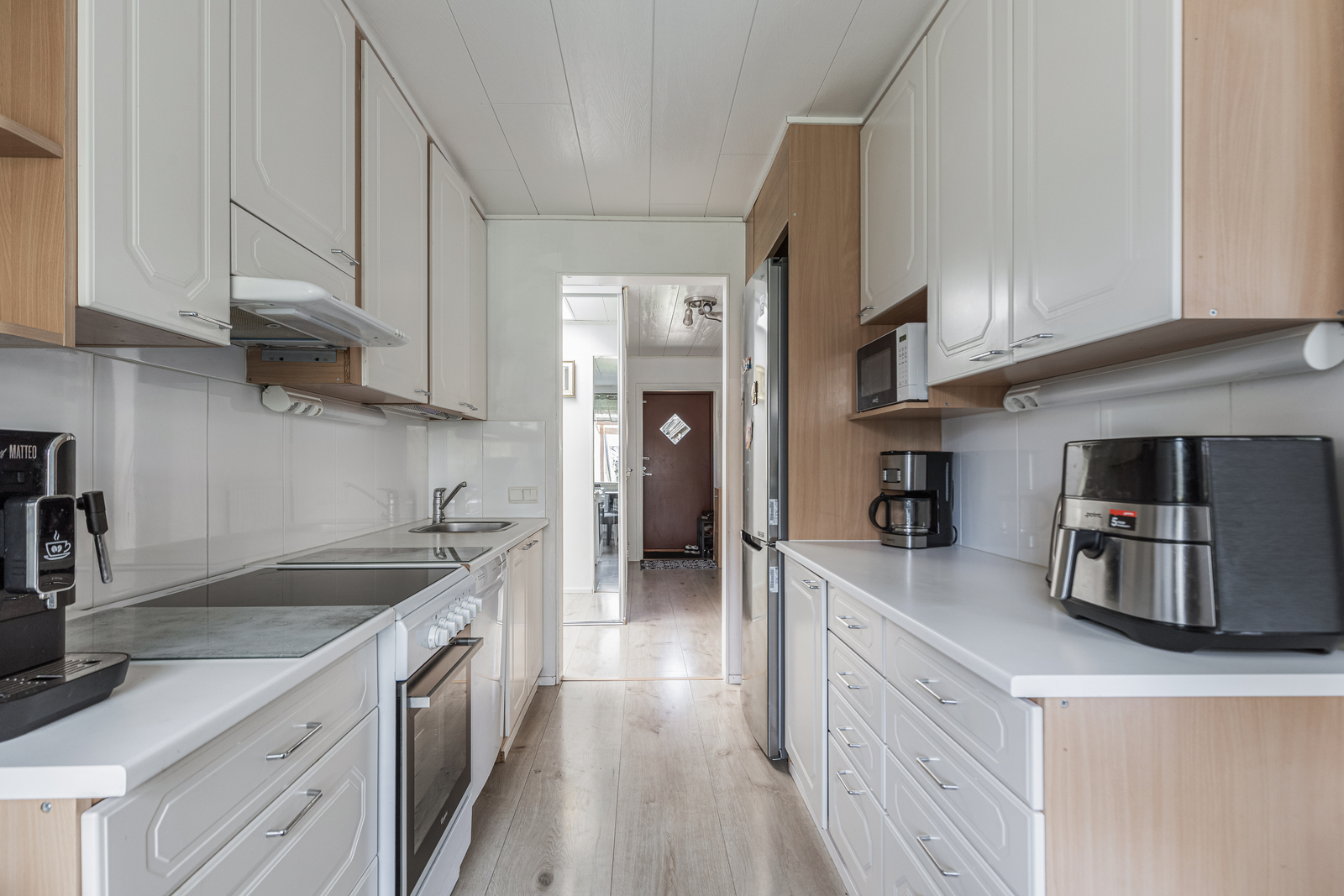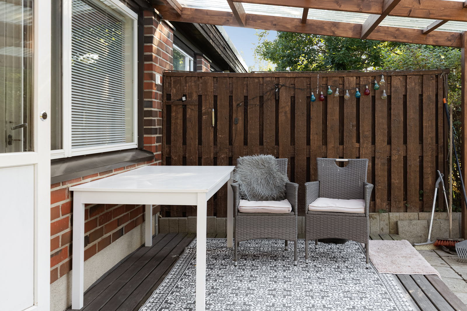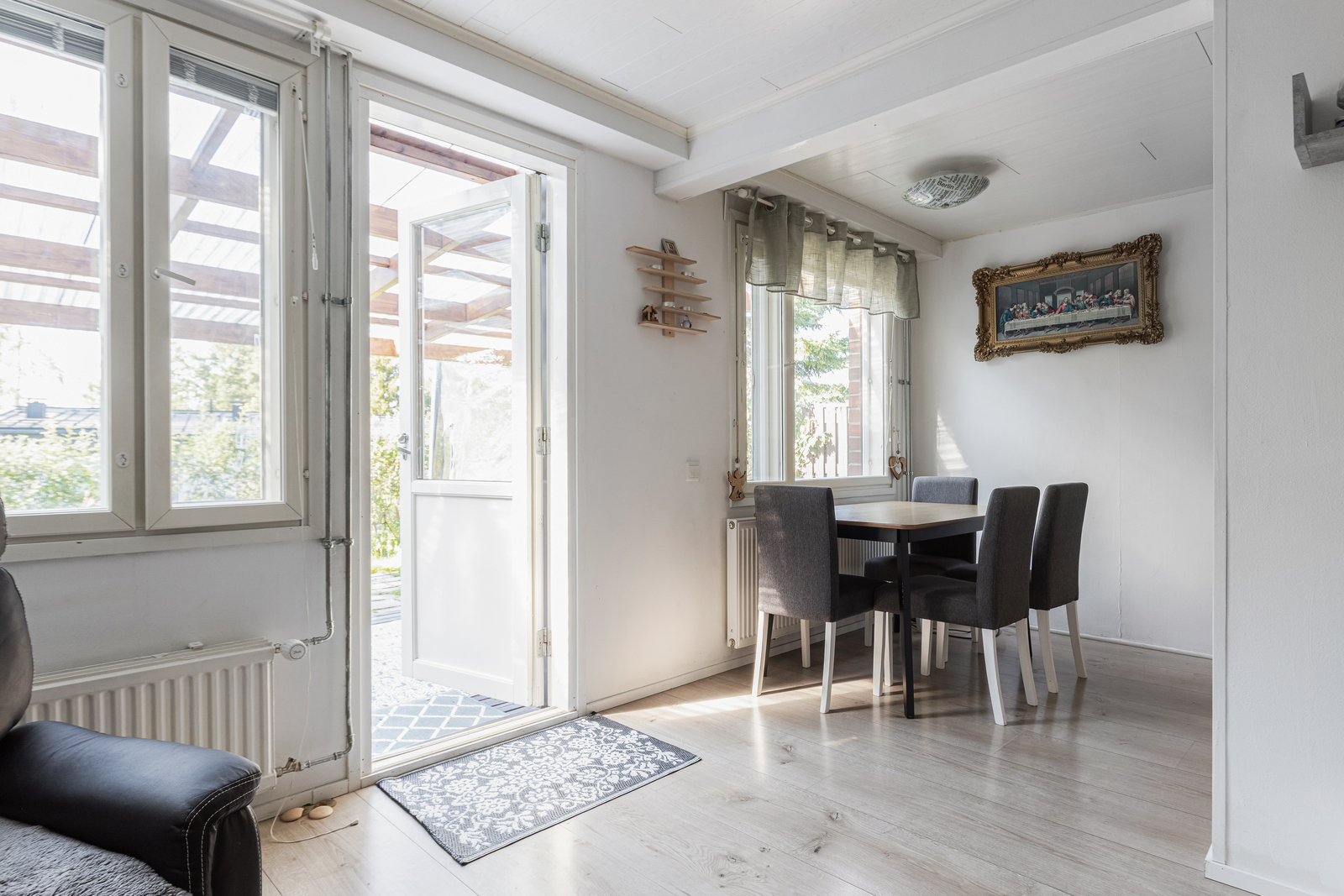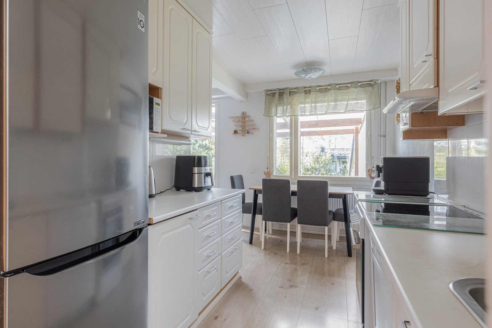Keittiö yhdistyy kivasti olohuoneeseen ja olohuoneesta on ovi katetulle terassille ja siitä nurmipihalle. Piha on erityisen suojainen ja siinä ei ole taloja vastassa, joten voit grillailla ja chillailla aivan rauhassa.