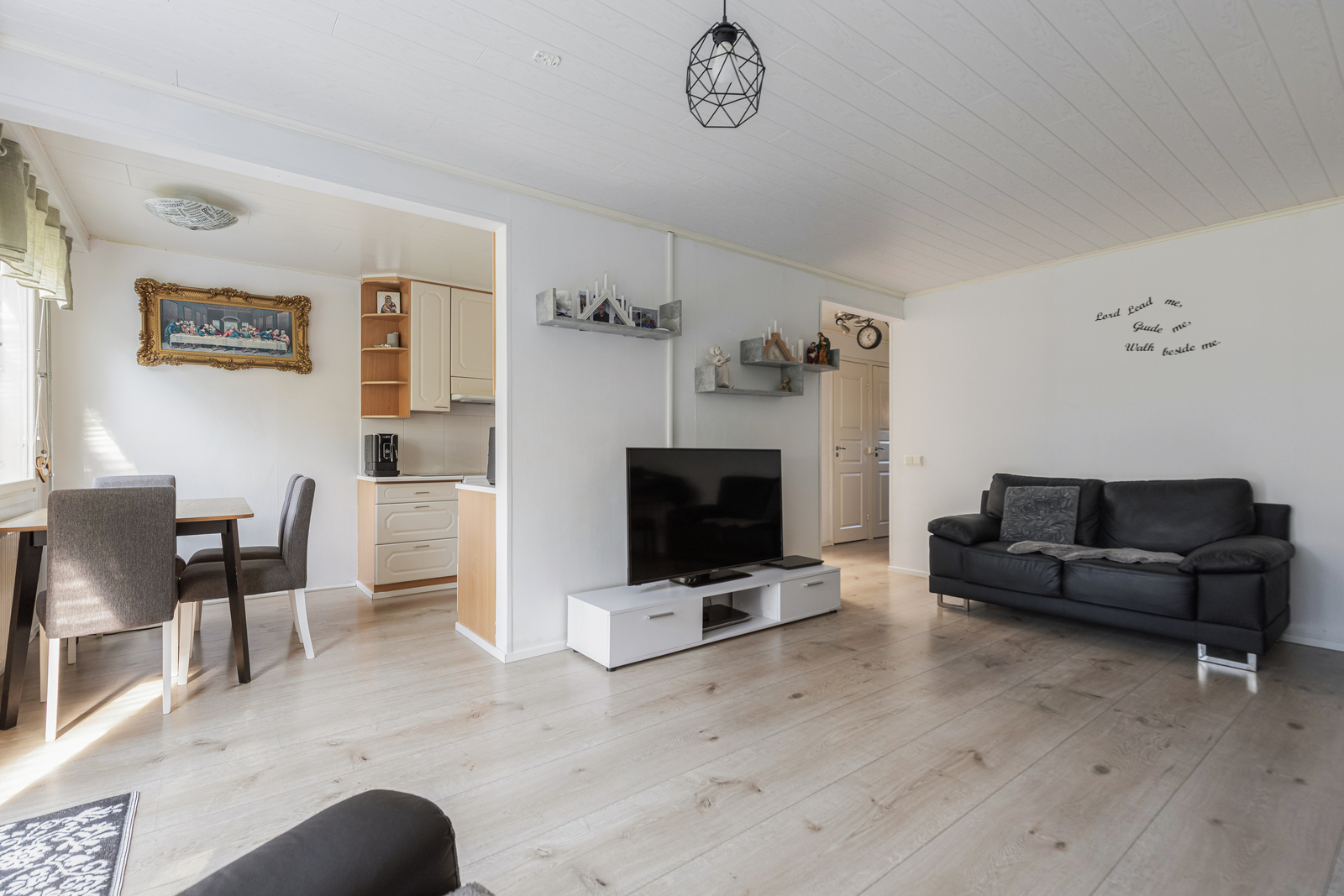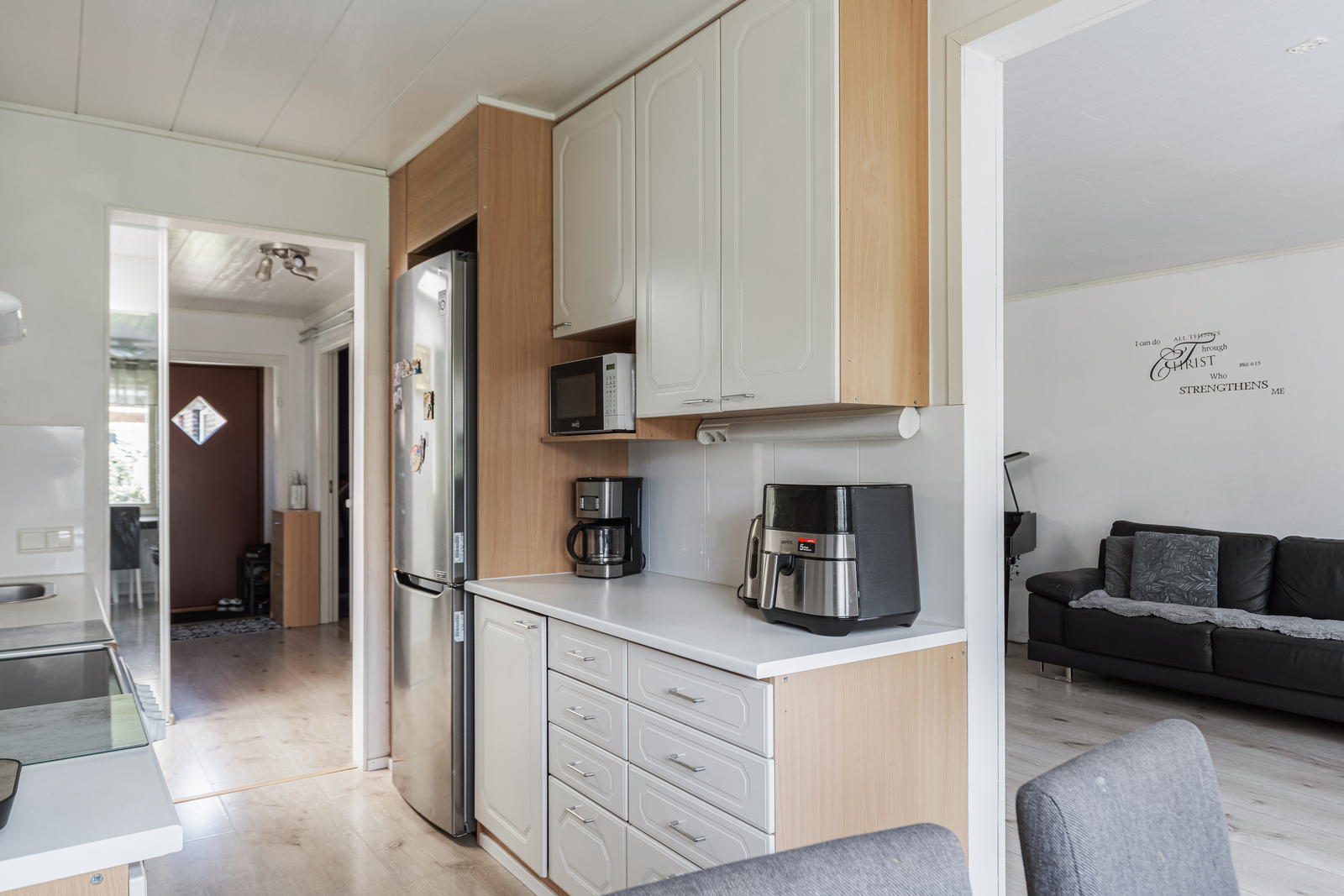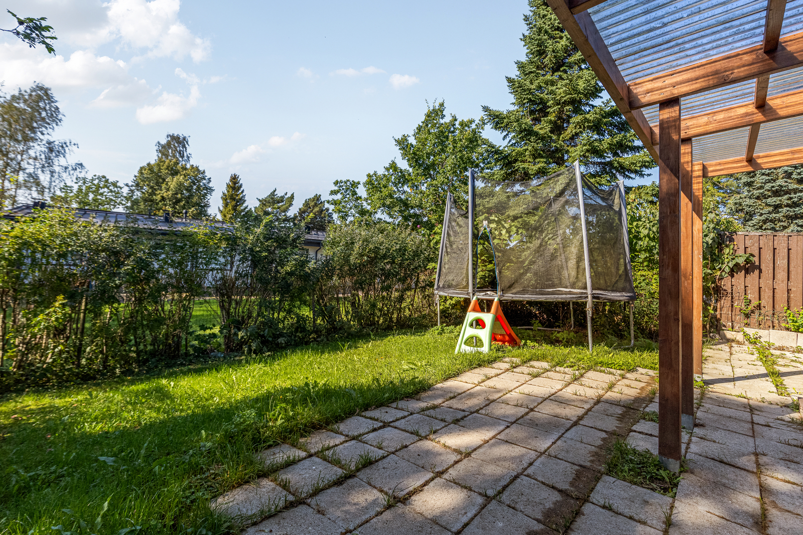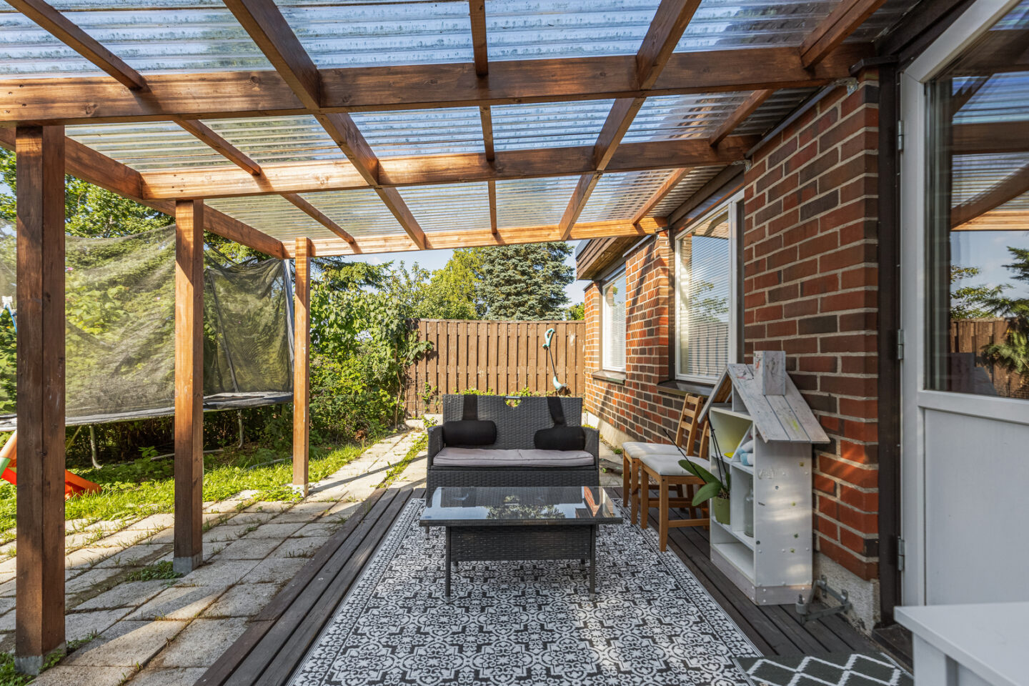 Keittiö yhdistyy kivasti olohuoneeseen ja olohuoneesta on ovi katetulle terassille ja siitä nurmipihalle. Piha on erityisen suojainen ja siinä ei ole taloja vastassa, joten voit grillailla ja chillailla aivan rauhassa.