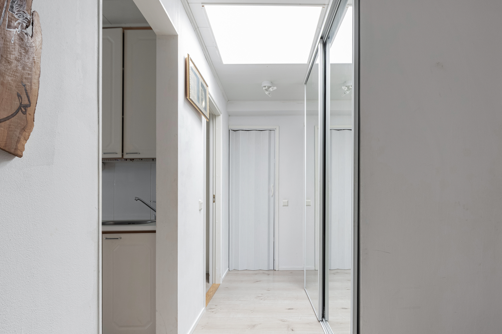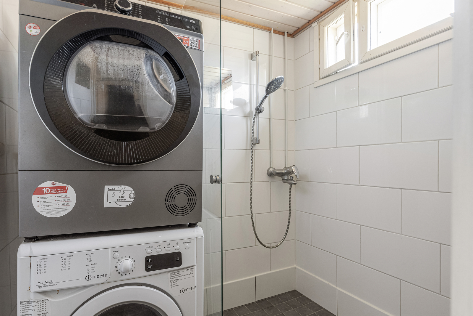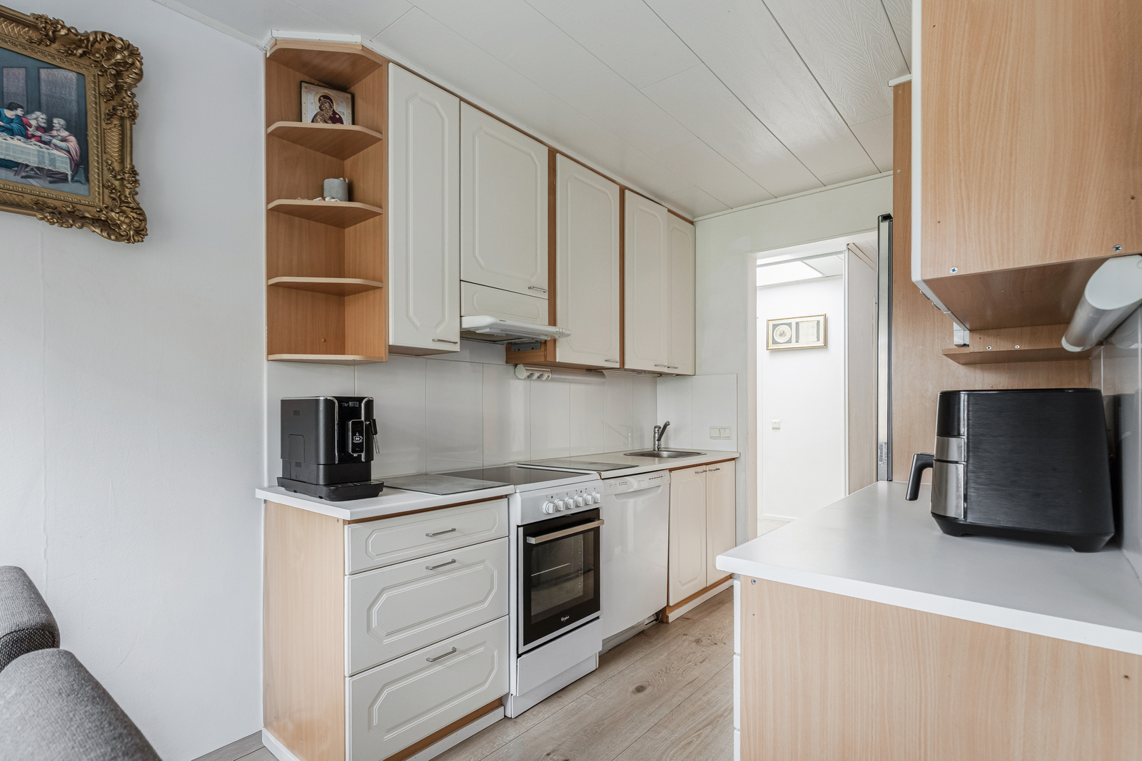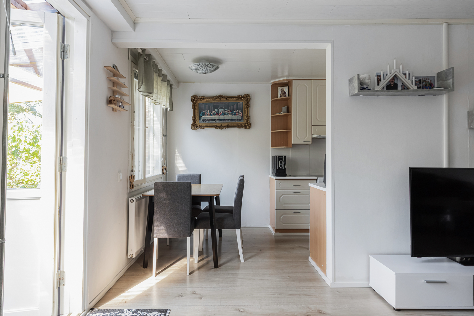 Keittiö yhdistyy kivasti olohuoneeseen ja olohuoneesta on ovi katetulle terassille ja siitä nurmipihalle. Piha on erityisen suojainen ja siinä ei ole taloja vastassa, joten voit grillailla ja chillailla aivan rauhassa.