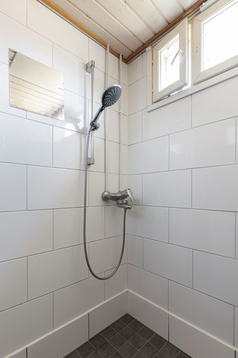 Asunnossa on kylpyhuone remontoitu tyylikkäin kaakelivalinnoin.