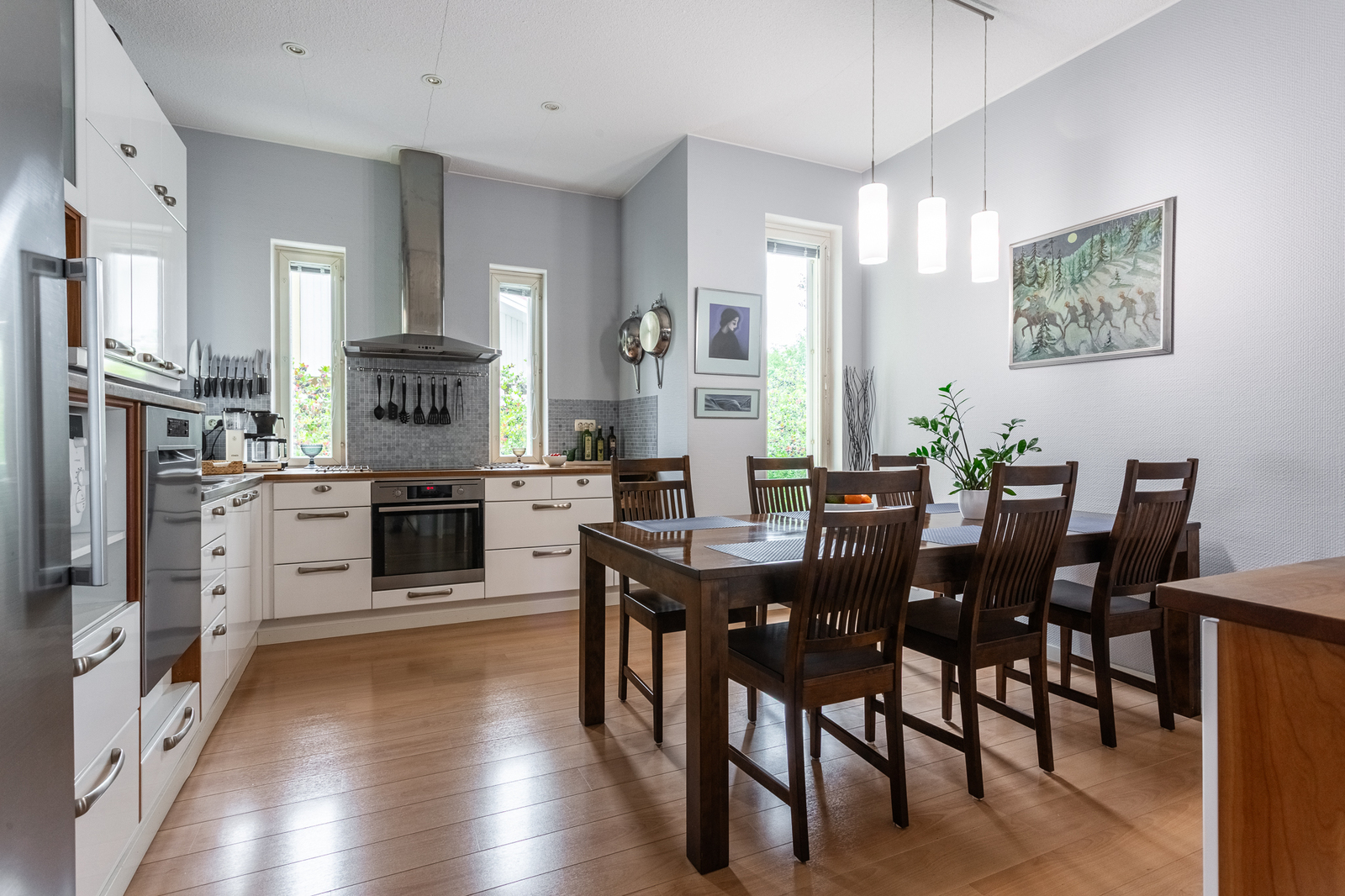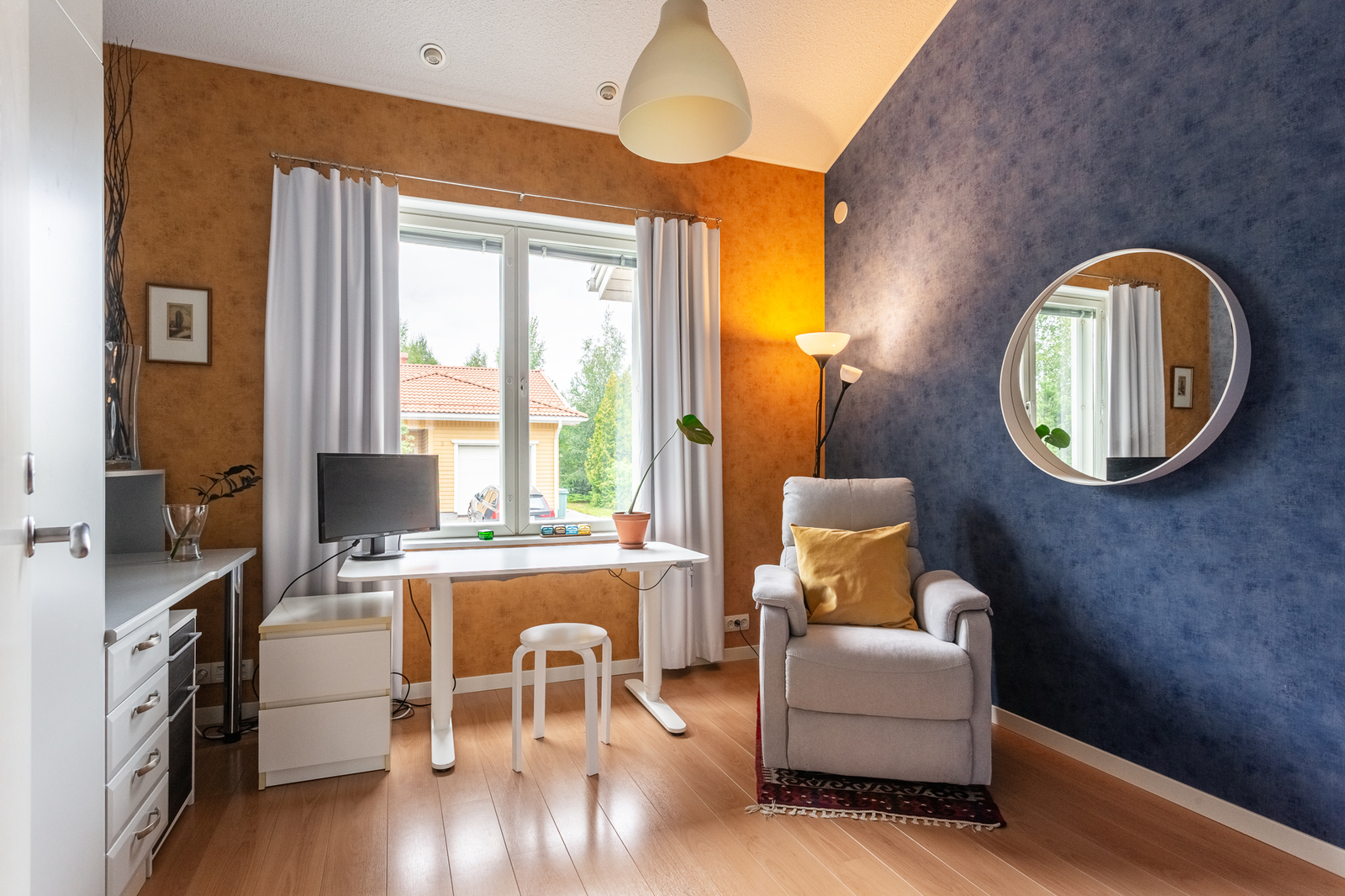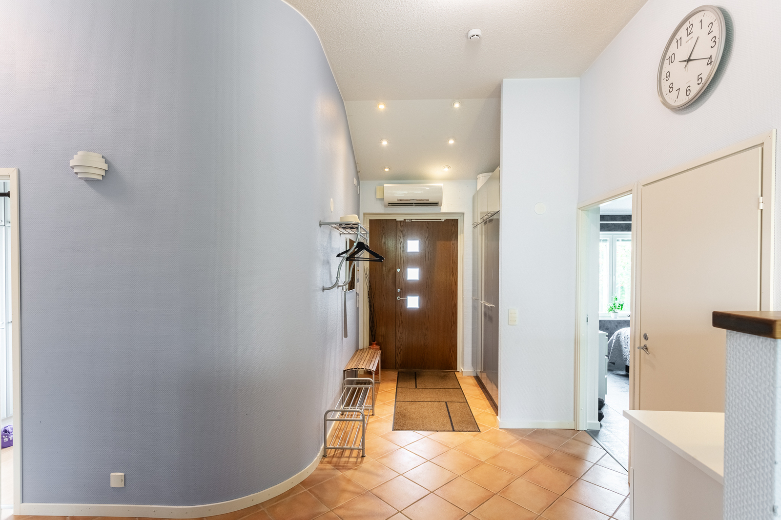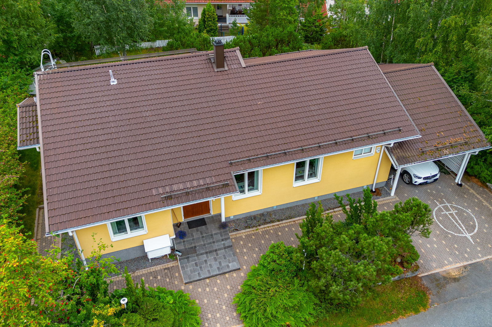 ilmettä ja avaruutta. Huonekorkeus keittiössä, olohuoneessa ja työhuoneessa 2,85 m ja eteinen, aula ja 2 makuhuonetta 3,3 m. (makuuhuoneissa osittain vino katto). Valoisa olohuone yhdistyy nykyaikaisesti keittiöön, jossa on runsaasti kaappi- ja laskutilaa. Kodista löytyy olohuoneen ja työhuoneen lisäksi neljä makuuhuonetta. Lisäksi työhuoneen voi tarvittaessa ottaa makuuhuoneeksi, joten tilaa riittää isommallekin perheelle. Sauna- ja pesutilat ovat tyylikkäät, ja käytännöllinen kodinhoitohuone helpottaa arkea. Talossa on kolme sisäänkäyntiä. Pääsisäänkäynnin lisäksi lasiterassilta pääsee suoraan kodinhoitohuoneeseen ja olohuoneeseen. Kodinhoitohuoneen ovella on kurasieppari ja vesipiste. Iso, noin 20 neliöinen lasitettu terassi toimii lisähuoneena suuren osan vuotta. Käyttöullakolla varastotilaa.