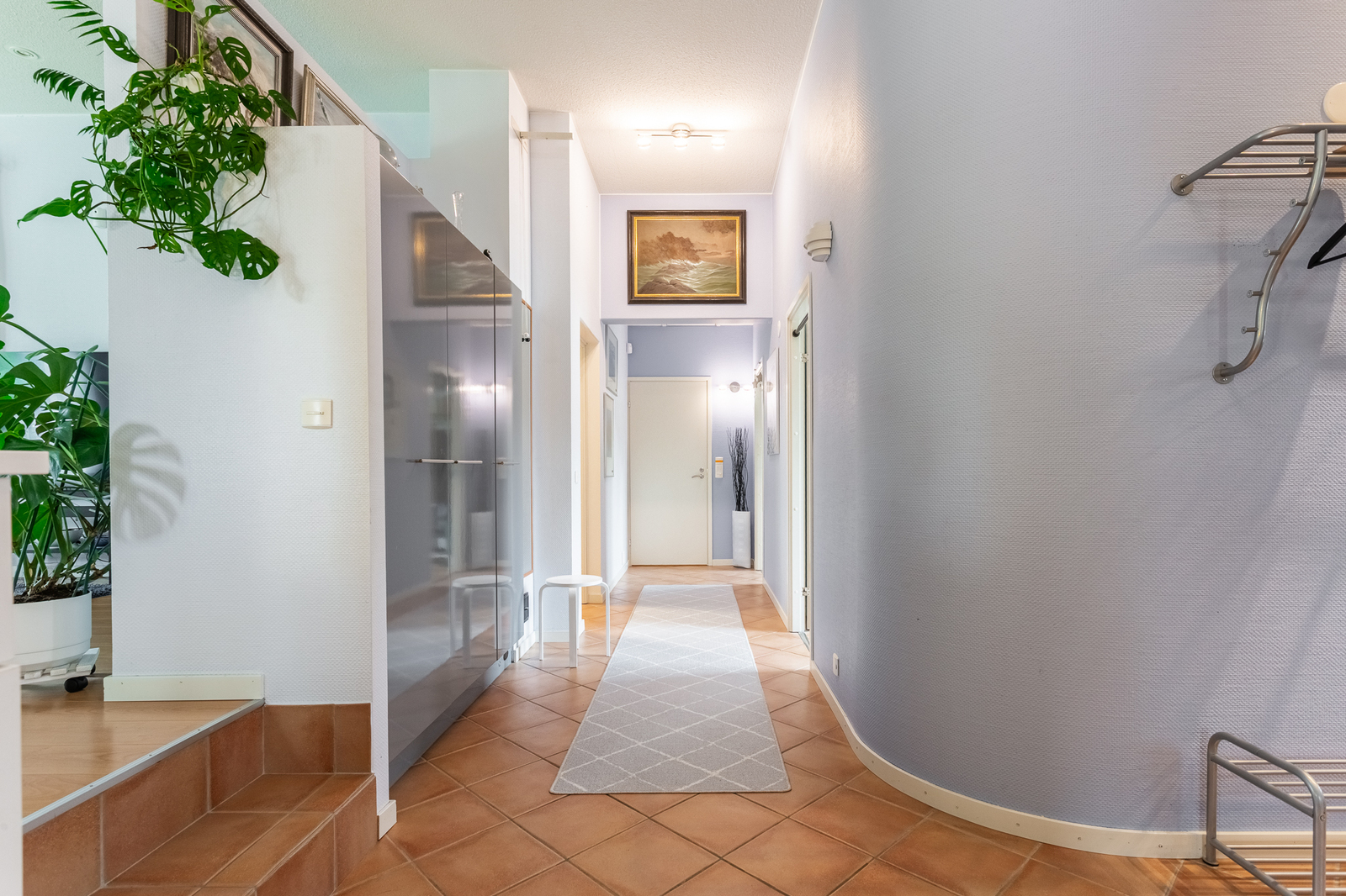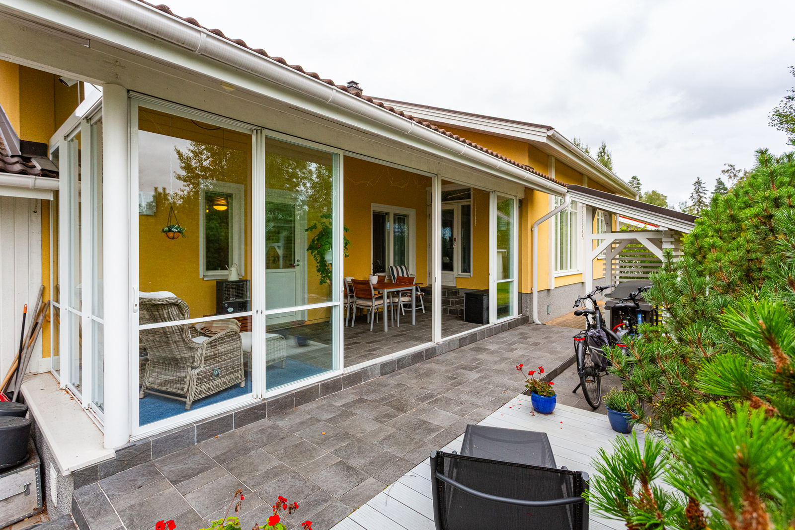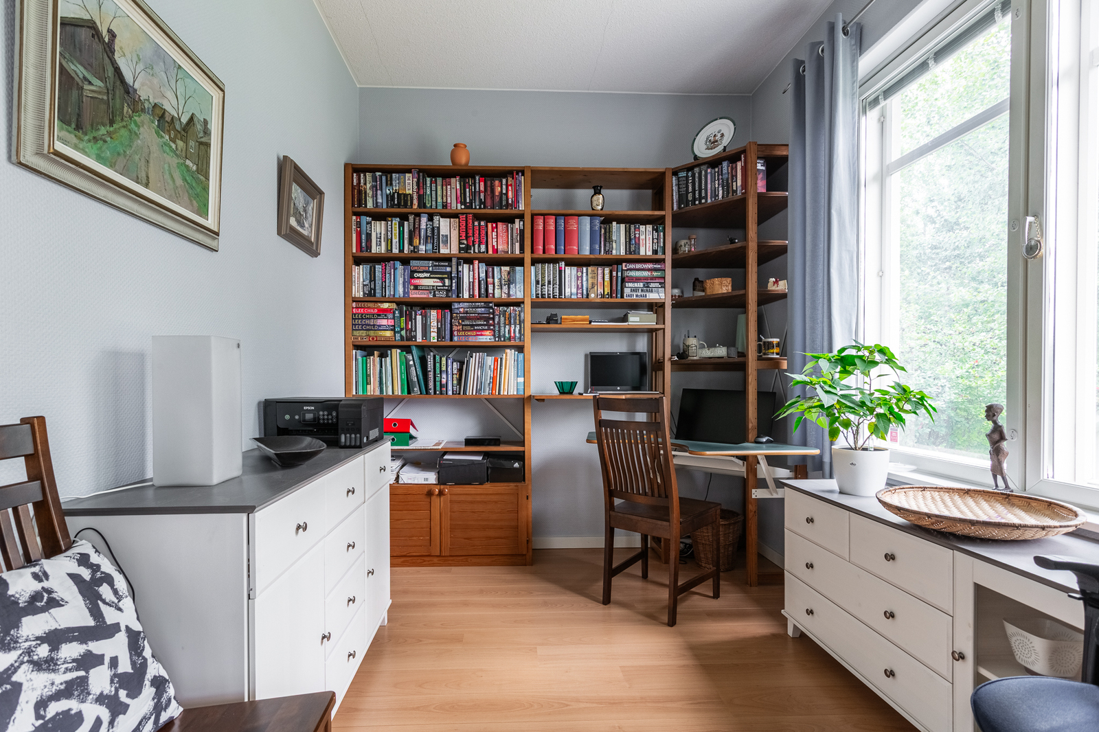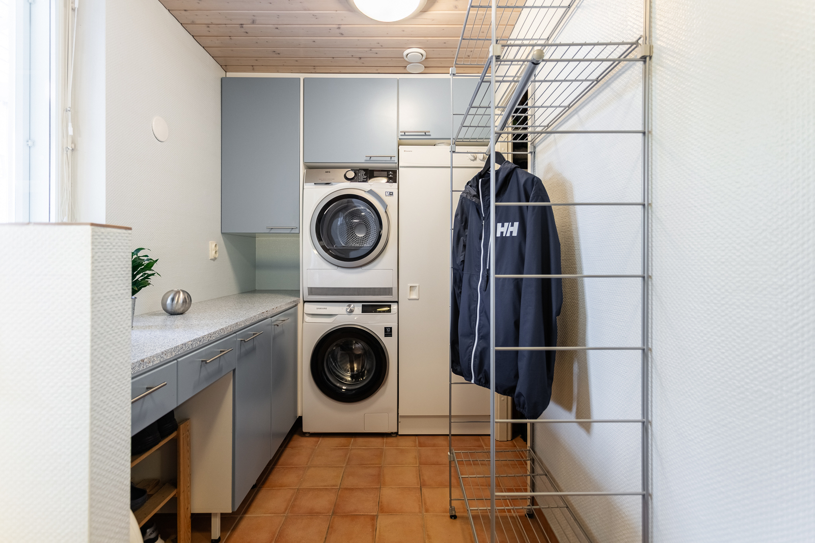 ilmettä ja avaruutta. Huonekorkeus keittiössä, olohuoneessa ja työhuoneessa 2,85 m ja eteinen, aula ja 2 makuhuonetta 3,3 m. (makuuhuoneissa osittain vino katto). Valoisa olohuone yhdistyy nykyaikaisesti keittiöön, jossa on runsaasti kaappi- ja laskutilaa. Kodista löytyy olohuoneen ja työhuoneen lisäksi neljä makuuhuonetta. Lisäksi työhuoneen voi tarvittaessa ottaa makuuhuoneeksi, joten tilaa riittää isommallekin perheelle. Sauna- ja pesutilat ovat tyylikkäät, ja käytännöllinen kodinhoitohuone helpottaa arkea. Talossa on kolme sisäänkäyntiä. Pääsisäänkäynnin lisäksi lasiterassilta pääsee suoraan kodinhoitohuoneeseen ja olohuoneeseen. Kodinhoitohuoneen ovella on kurasieppari ja vesipiste. Iso, noin 20 neliöinen lasitettu terassi toimii lisähuoneena suuren osan vuotta. Käyttöullakolla varastotilaa.