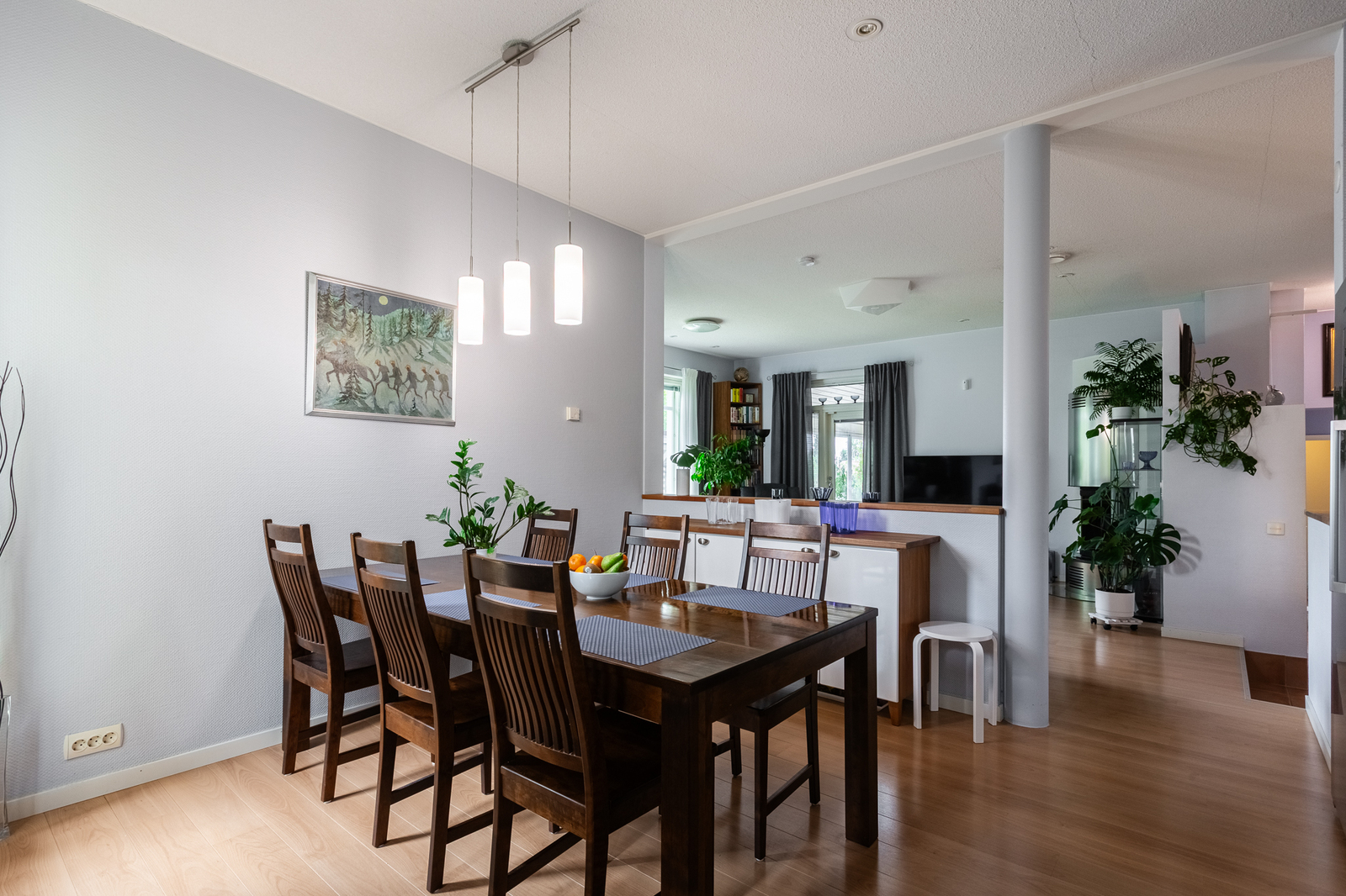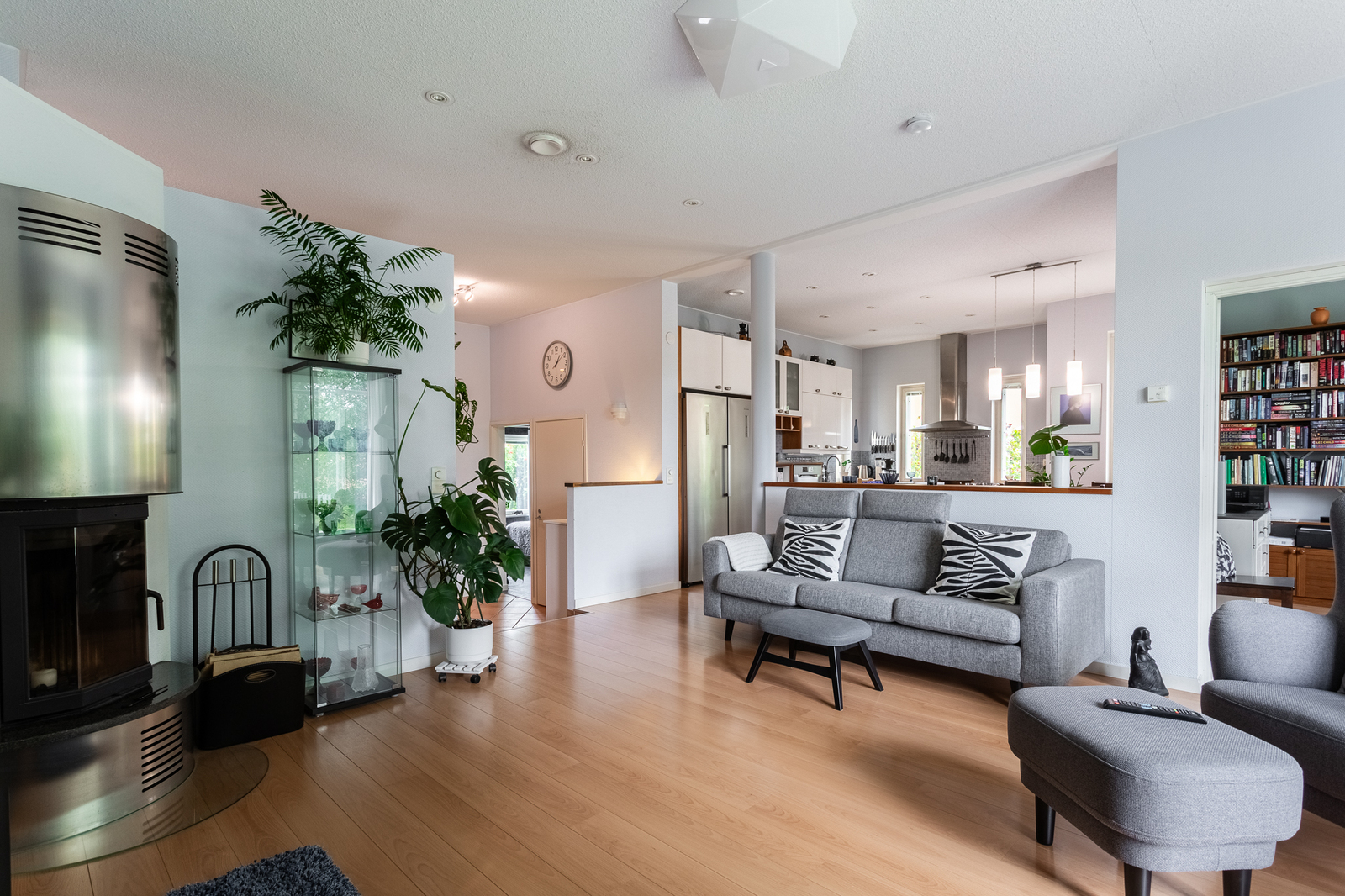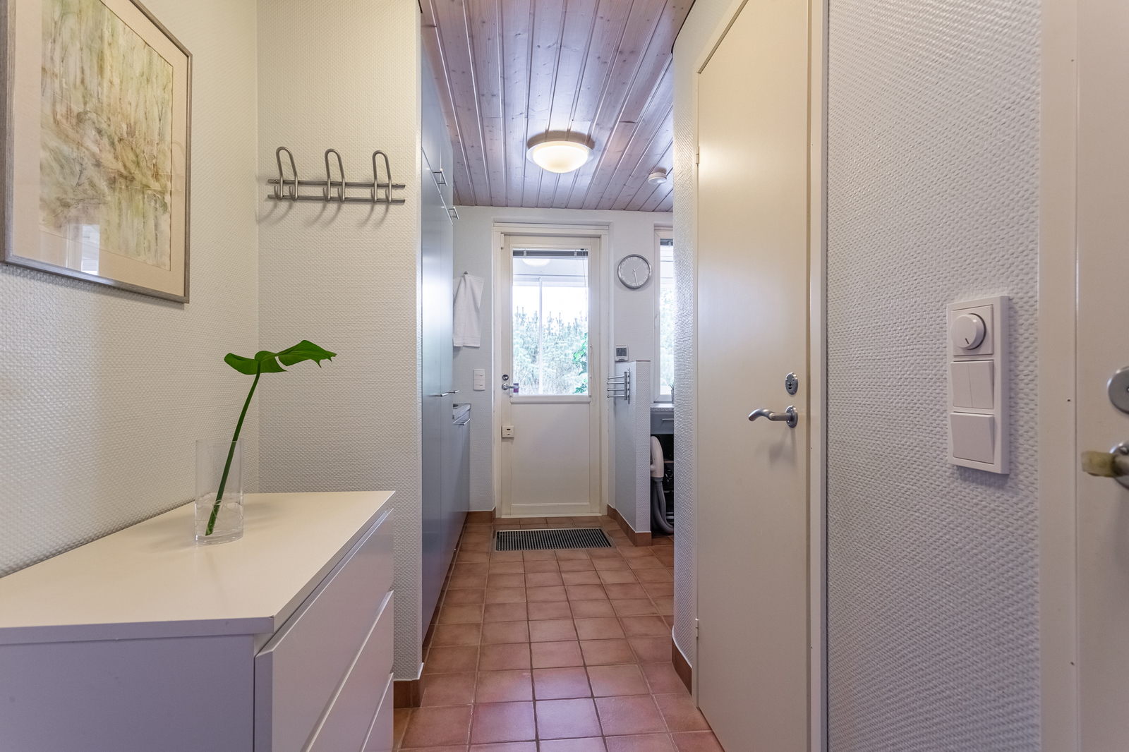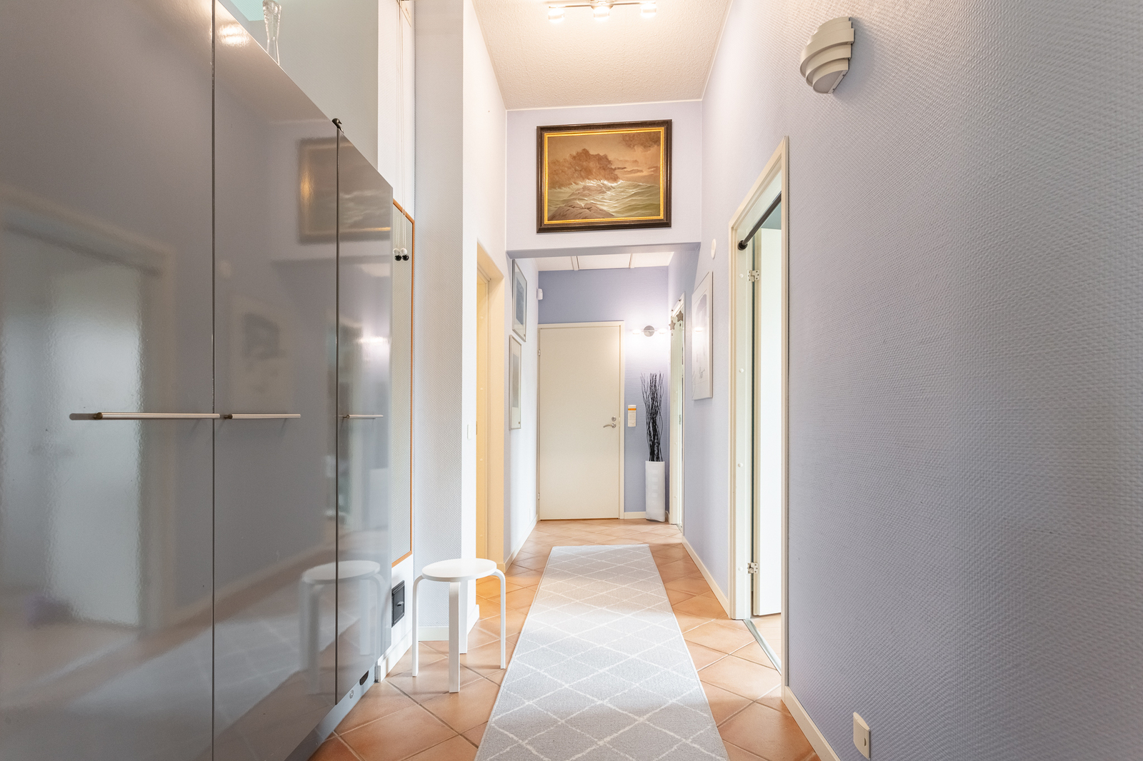 ilmettä ja avaruutta. Huonekorkeus keittiössä, olohuoneessa ja työhuoneessa 2,85 m ja eteinen, aula ja 2 makuhuonetta 3,3 m. (makuuhuoneissa osittain vino katto). Valoisa olohuone yhdistyy nykyaikaisesti keittiöön, jossa on runsaasti kaappi- ja laskutilaa. Kodista löytyy olohuoneen ja työhuoneen lisäksi neljä makuuhuonetta. Lisäksi työhuoneen voi tarvittaessa ottaa makuuhuoneeksi, joten tilaa riittää isommallekin perheelle. Sauna- ja pesutilat ovat tyylikkäät, ja käytännöllinen kodinhoitohuone helpottaa arkea. Talossa on kolme sisäänkäyntiä. Pääsisäänkäynnin lisäksi lasiterassilta pääsee suoraan kodinhoitohuoneeseen ja olohuoneeseen. Kodinhoitohuoneen ovella on kurasieppari ja vesipiste. Iso, noin 20 neliöinen lasitettu terassi toimii lisähuoneena suuren osan vuotta. Käyttöullakolla varastotilaa.