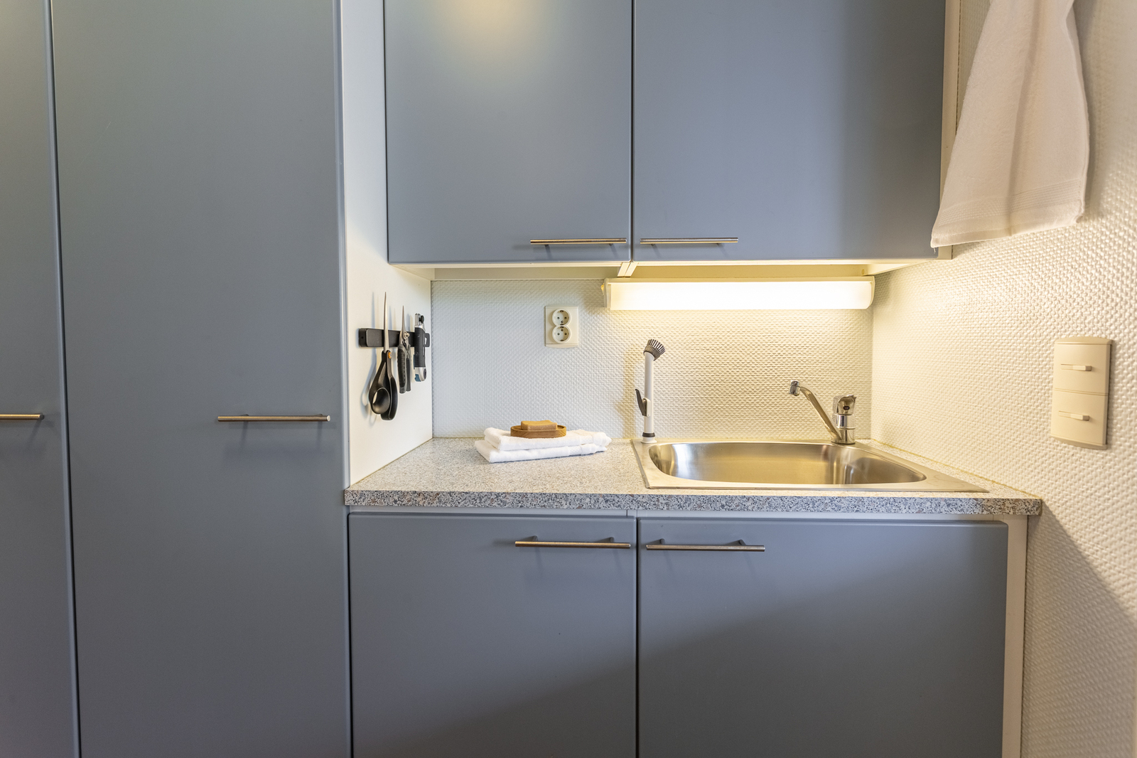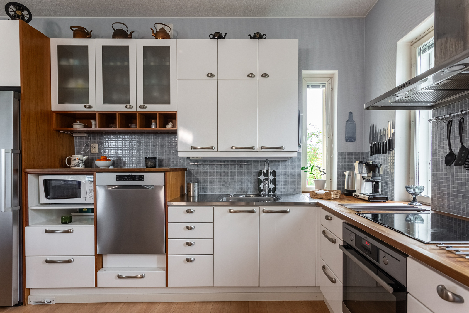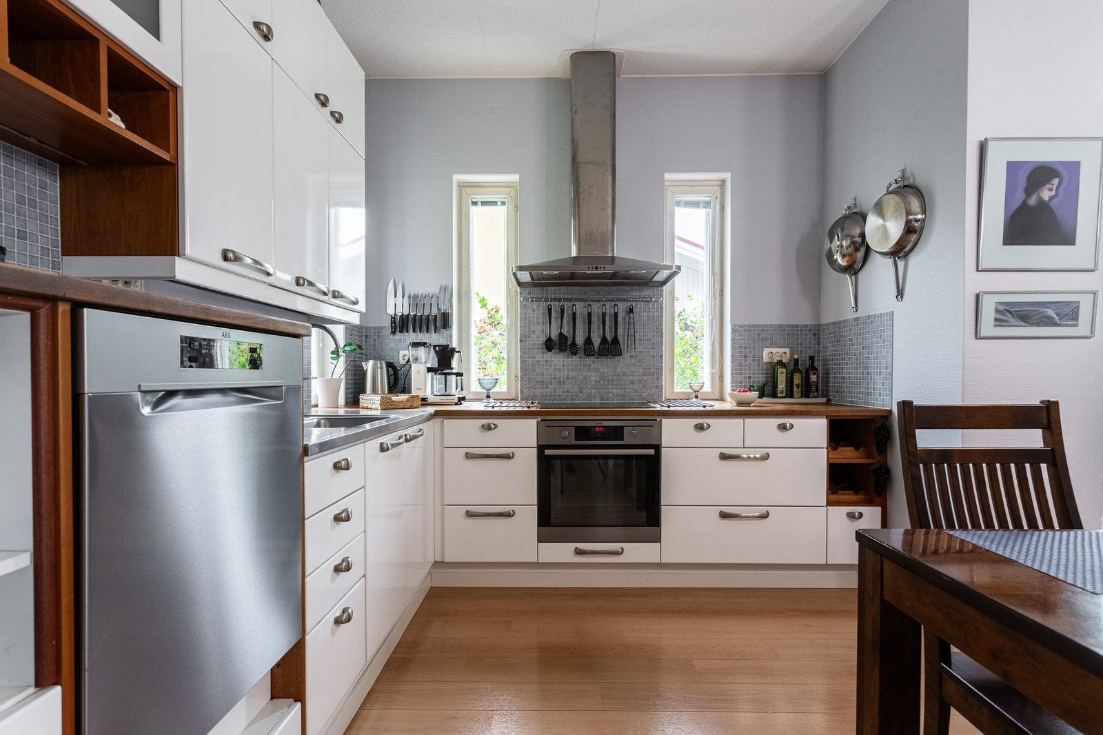 | Keittiön kuvaus | Liesi (Induktioliesi ja erillisuuni), työtasot (puu), seinät (lasikuitutapetti), lattiat (laminaatti), astianpesukone, erillisuuni, erillinen pakastin, liesi, jääkaappi ja liesituuletin / hormi |