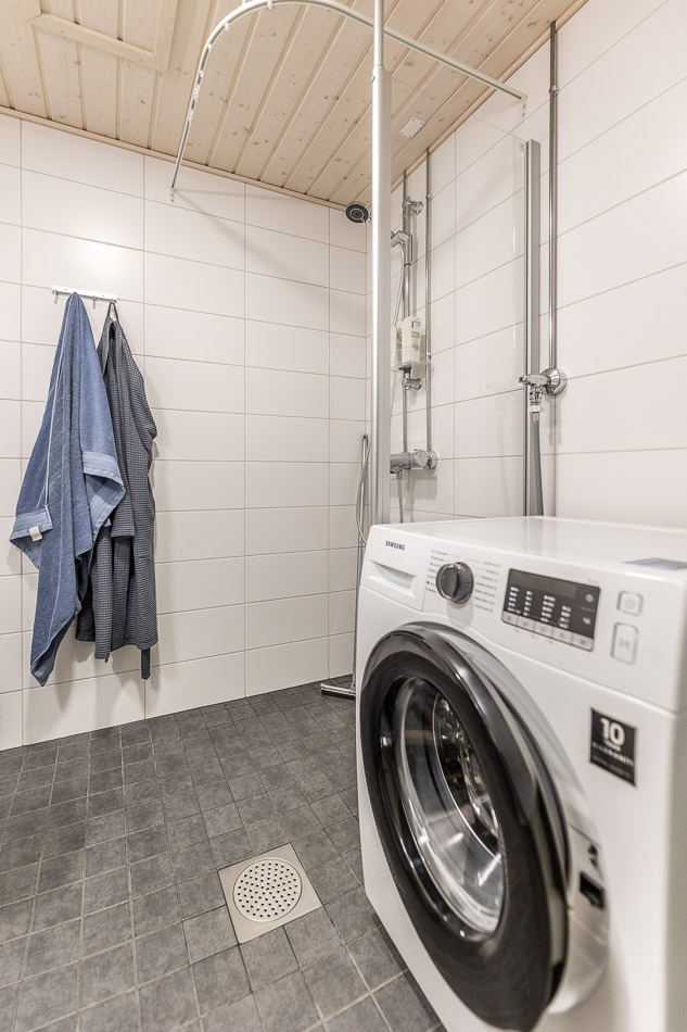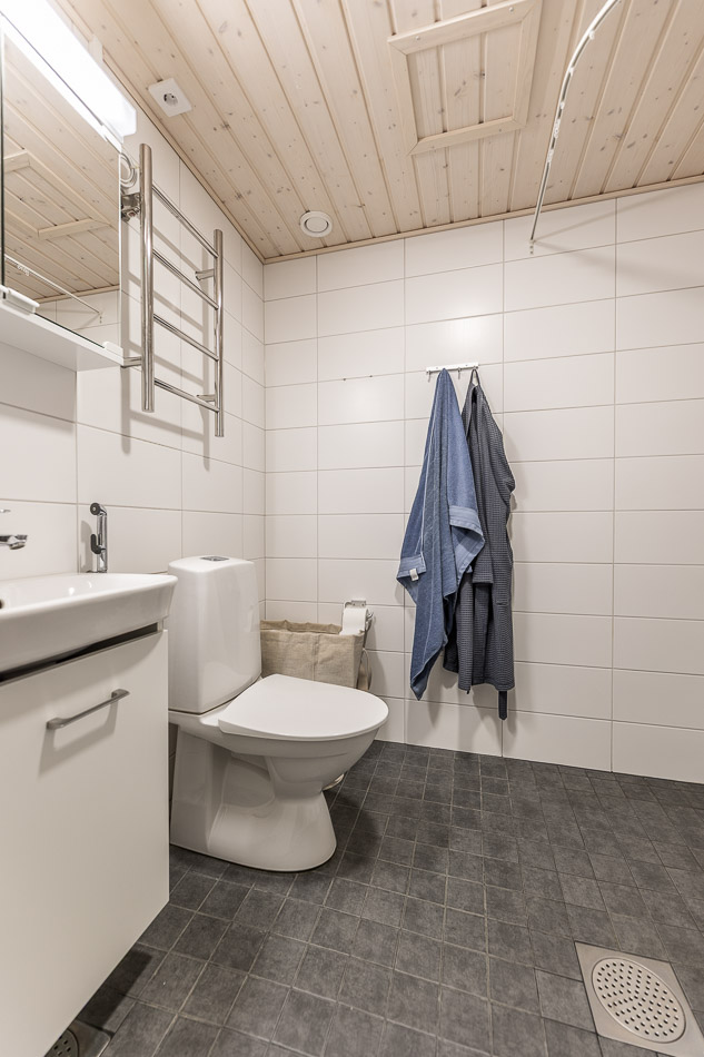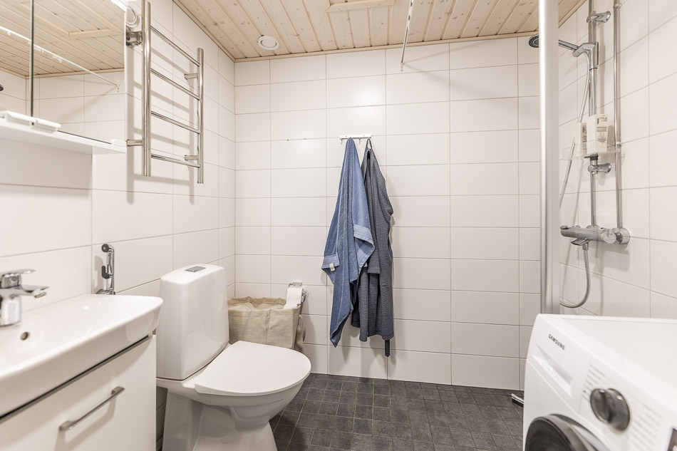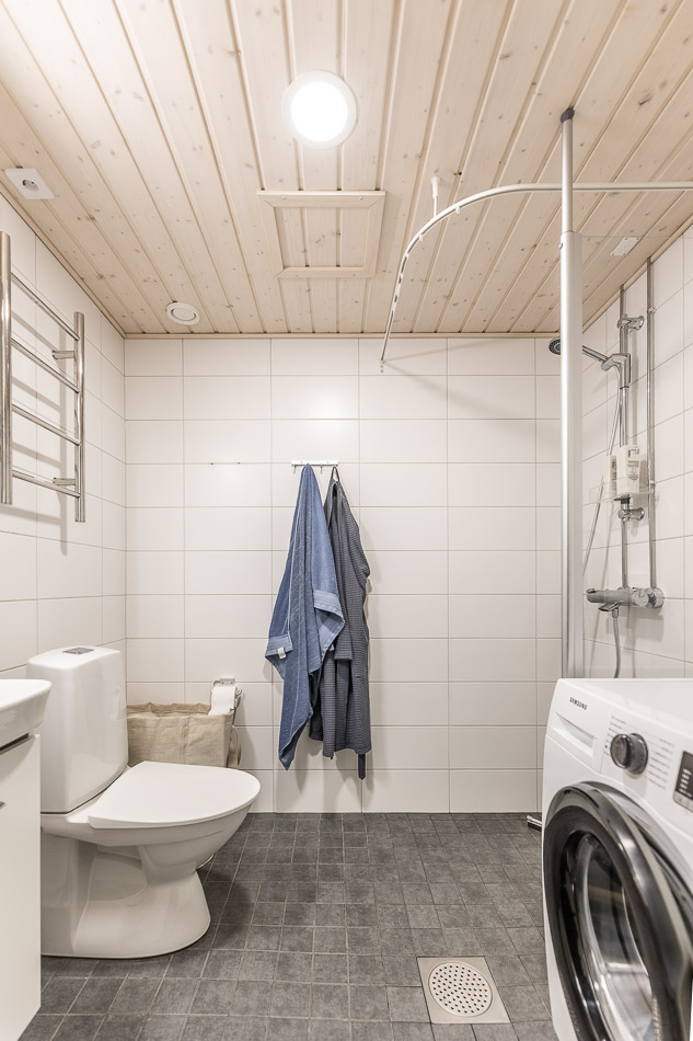 WC-istuin, suihku, peilikaappi, pesukoneliitäntä ja pesuallas, seinät (kaakeli), lattiat (laatta) |