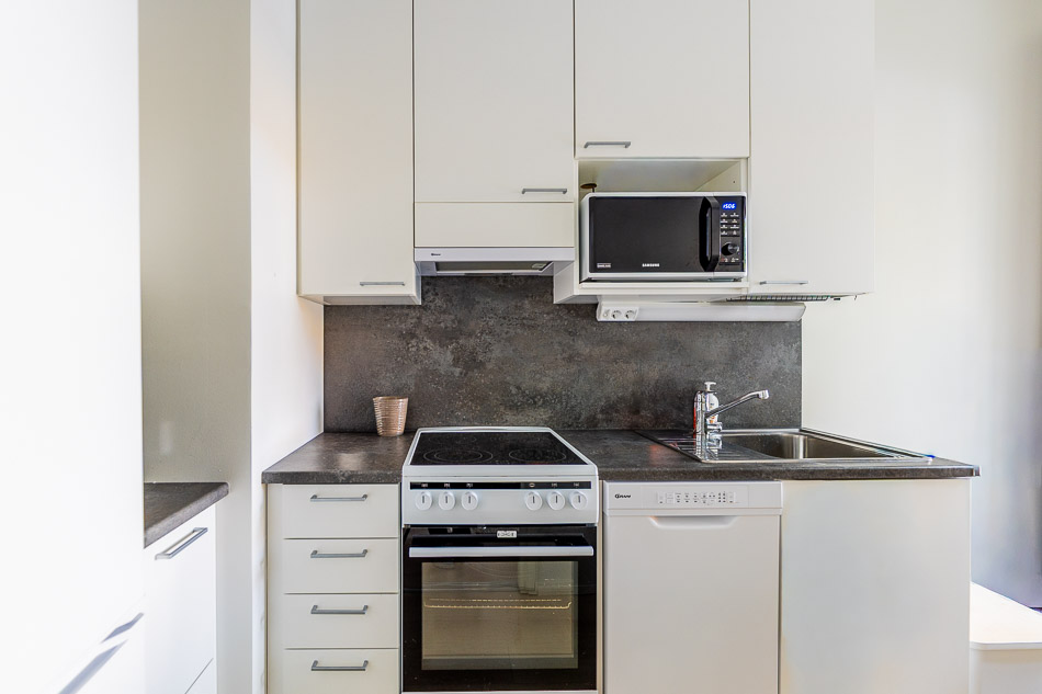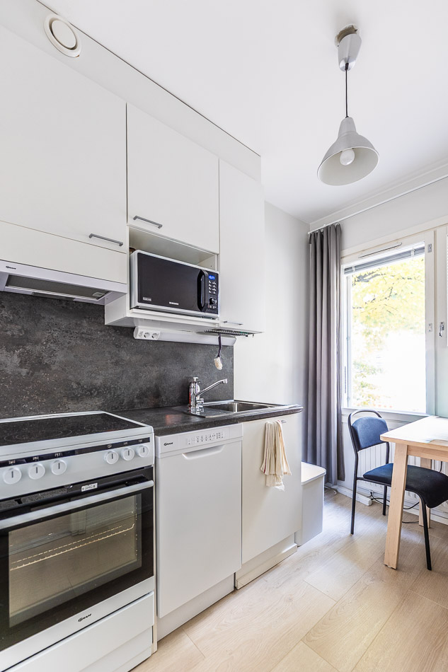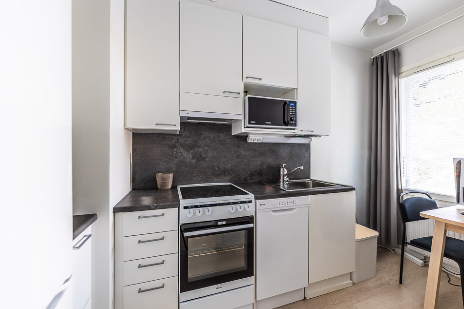 Liesi (Keraaminen liesi), työtasot (laminaatti), seinät (maali), lattiat (laminaatti), jääkaappipakastin, liesi ja astianpesukone |