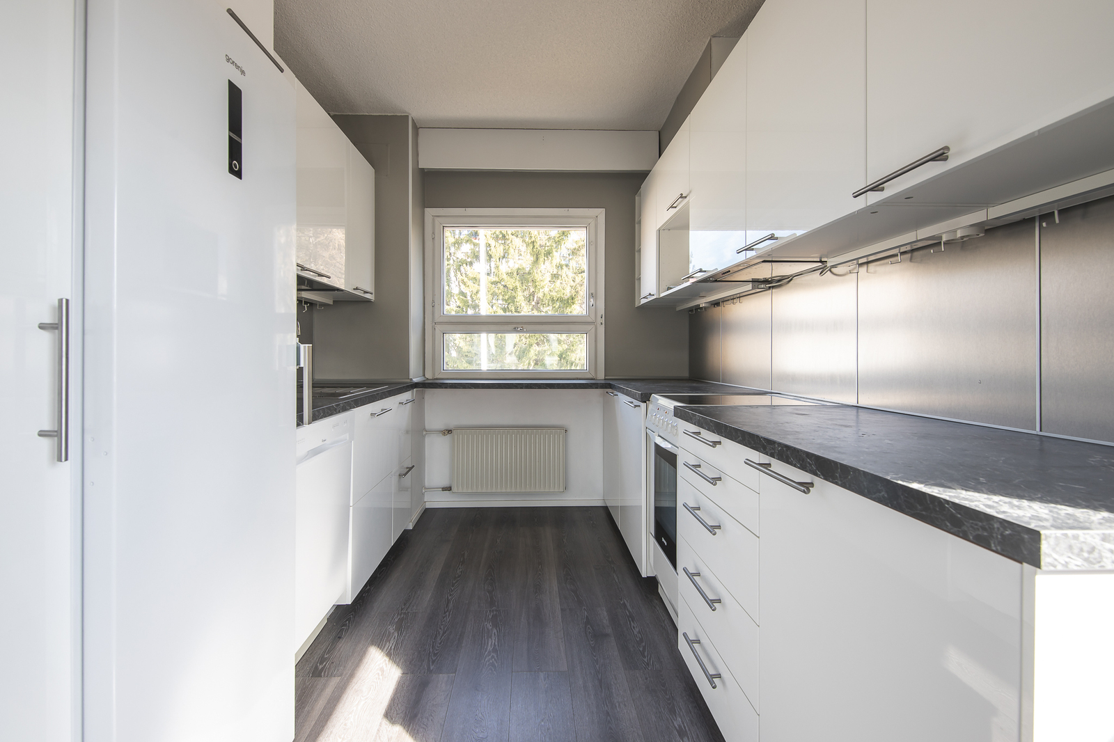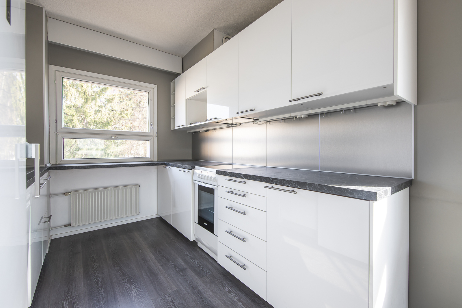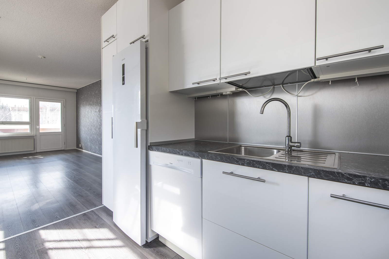 Keittiön kuvaus Liesi (Keraaminen liesi), työtasot (laminaatti), seinät (maali), lattiat (laminaatti), astianpesukone, jääkaappi, liesituuletin ja kiinteät valaisimet, Välitilassa alumiini levyt